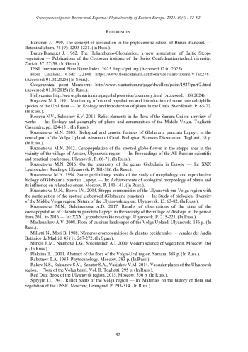 2. [Braun-Blanquet] Braun-Blanquet J. 1962. Das Helianthemo-Globularion, ein neuer Verband der baltischen Steppenvegetation in Veroffentlichungen des ceobotanischen institutes der eidg.techn.Hochschule, stiftung rubel, in zurich. 37: 27-38. IPNI: International Plant Name Index. 2025. http://ipni.org (Дата обращения: 12.01.2025).