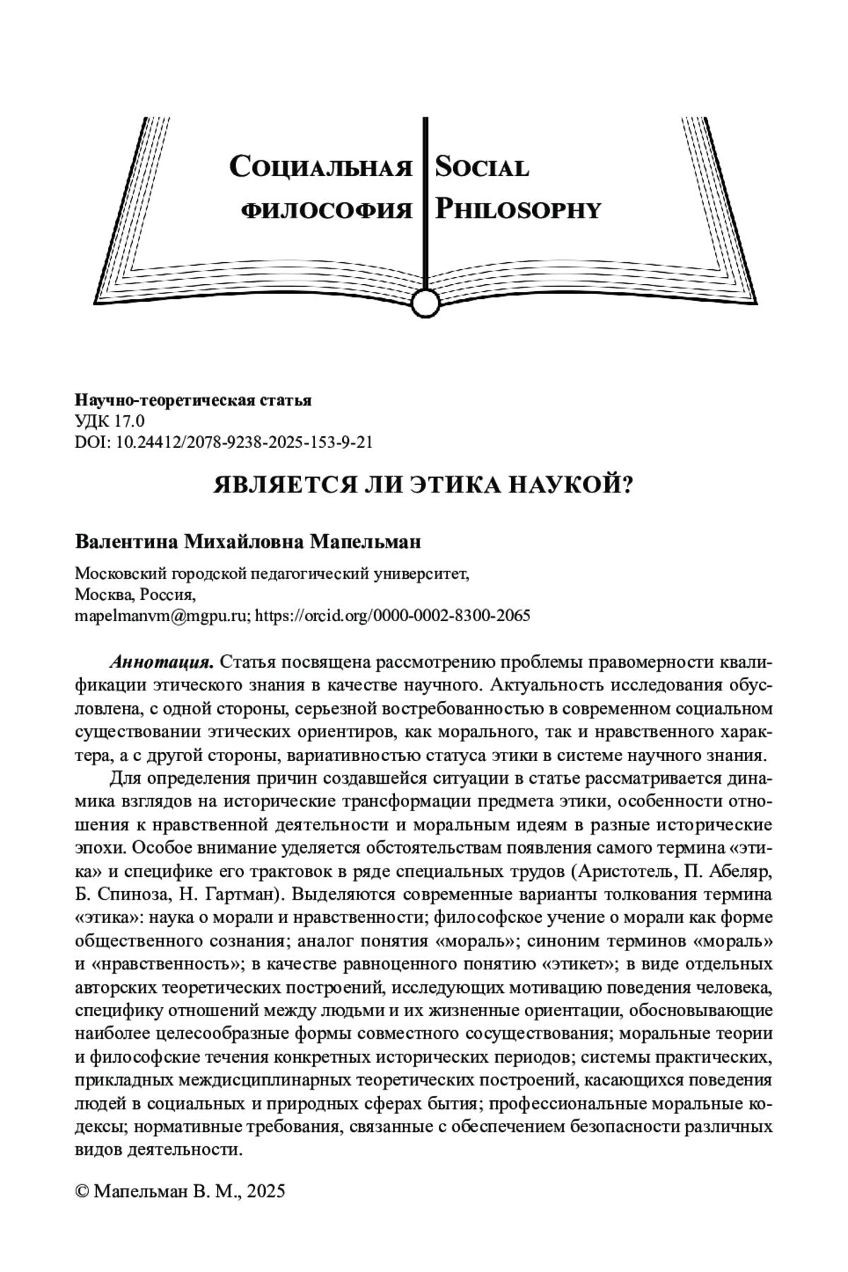 Статья посвящена рассмотрению проблемы правомерности квалификации этического знания в качестве научного. Актуальность исследования обусловлена, с одной стороны, серьезной востребованностью в современном социальном существовании этических ориентиров, как морального, так и нравственного характера, а с другой стороны, вариативностью статуса этики в системе научного знания. Для определения причин создавшейся ситуации в статье рассматривается динамика взглядов на исторические трансформации предмета этики, особенности отношения к нравственной деятельности и моральным идеям в разные исторические эпохи. Особое внимание уделяется обстоятельствам появления самого термина «этика» и специфике его трактовок в ряде специальных трудов (Аристотель, П. Абеляр, Б. Спиноза, Н. Гартман). Выделяются современные варианты толкования термина «этика»: наука о морали и нравственности; философское учение о морали как форме общественного сознания; аналог понятия «мораль»; синоним терминов «мораль» и «нравственность»; в качестве равноценного понятию «этикет»; в виде отдельных авторских теоретических построений, исследующих мотивацию поведения человека, специфику отношений между людьми и их жизненные ориентации, обосновывающие наиболее целесообразные формы совместного сосуществования; моральные теории и философские течения конкретных исторических периодов; системы практических, прикладных междисциплинарных теоретических построений, касающихся поведения людей в социальных и природных сферах бытия; профессиональные моральные кодексы; нормативные требования, связанные с обеспечением безопасности различных видов деятельности. Осуществляется соотношение общих представлений о сути, признаках, критериях и функциях любой науки с аналогичными параметрами, характерными для этики. Оцениваются претензии современной этики на статус теоретической научной системы.