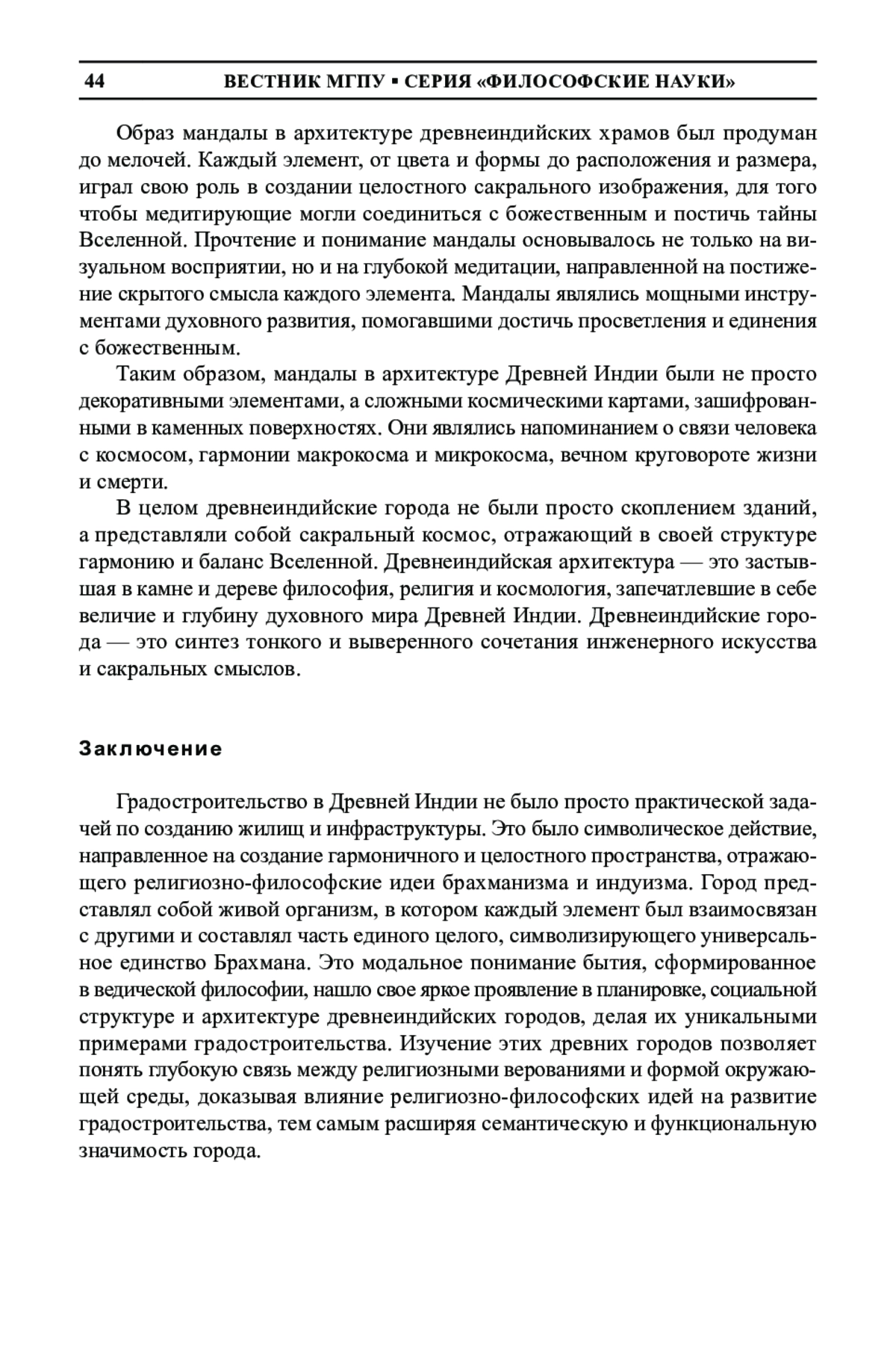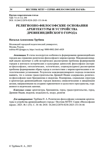 В статье исследуется особенность формирования древнеиндийских городов как отражение религиозно-философского мировоззрения. Междисциплинарный анализ включает в себя историческое рассмотрение проблемы формирования городов в контексте исторических и культурных ценностей; философское (историко-философское, онтологическое, эстетическое, социокультурное) рассмотрение проблемы формирования образа города в соответствии с мировоззренческими и онтологическими установками. Результаты междисциплинарного подхода позволили выявить, что в основе градостроительства Древней Индии содержались религиозно-философские идеи брахманизма и индуизма. Планировка, социальная структура и архитектура древнеиндийских городов являлись символическими и священными актами, направленными на создание гармоничного и целостного пространства, отраженного в ведических канонах.