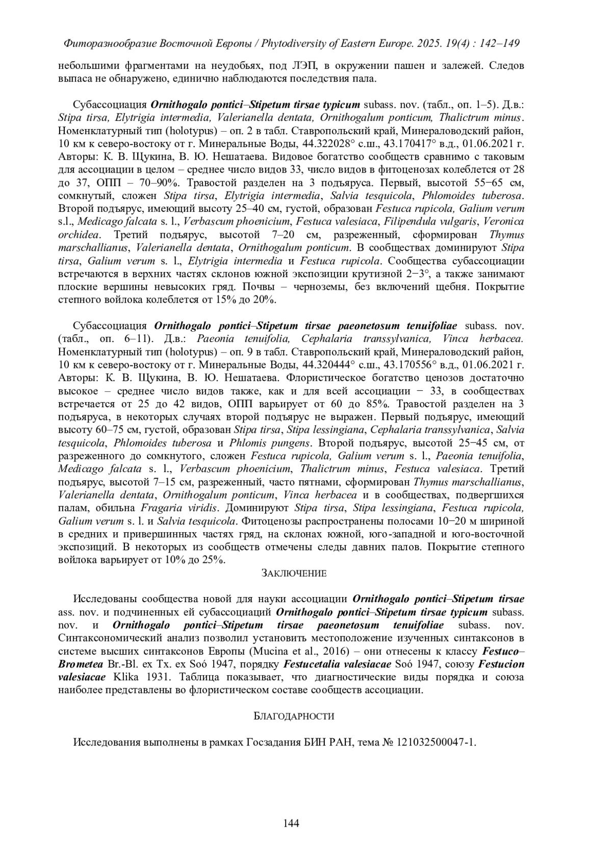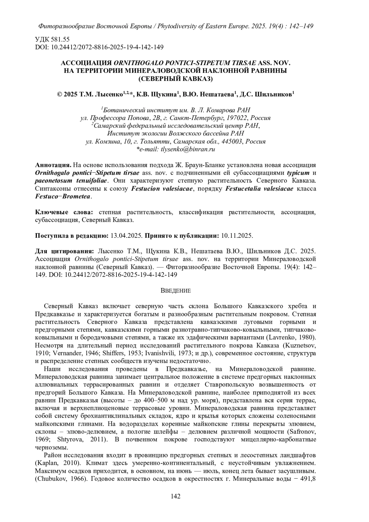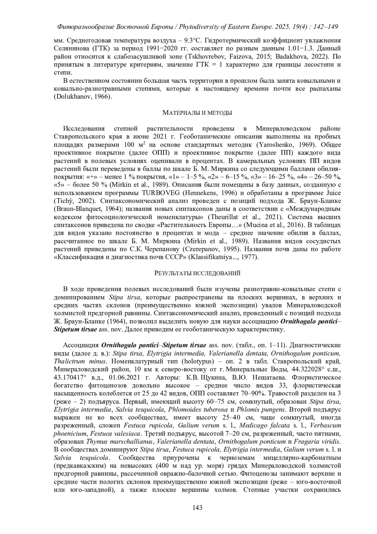 На основе использования подхода Ж. Браун-Бланке установлена новая ассоциация Ornithogalo pontici - Stipetum tirsae ass. nov. с подчиненными ей субассоциациями typicum и paeonetosum tenuifoliae. Они характеризуют степную растительность Северного Кавказа. Синтаксоны отнесены к союзу Festucion valesiacae, порядку Festucetalia valesiacae класса Festuco - Brometea.