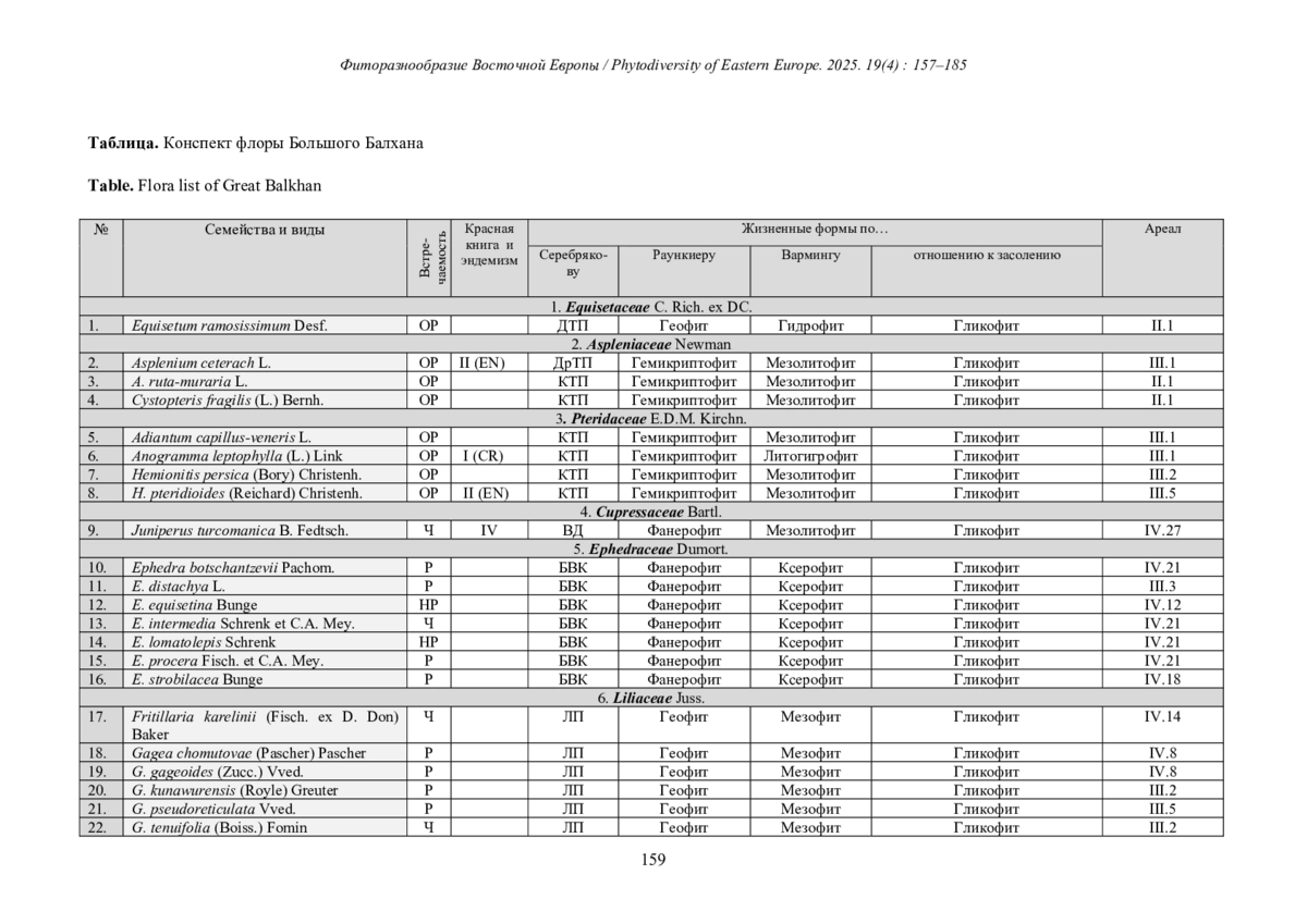 По результатам исследований во флоре Большого Балхана и его предгорий выявлено 613 видов сосудистых растений из 64 семейств (табл.). Составлен конспект флоры данного региона, в котором для каждого вида приведены биоморфологическая, экологическая и хорологическая характеристики. Учтены аборигенные и адвентивные виды. В конспекте указана встречаемость каждого вида, а также отмечены растения, занесенные в новое издание Красной книги Туркменистана (Red…, 2024) (рис.). Данные конспекта позволили провести полный анализ флоры исследованного района.