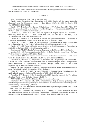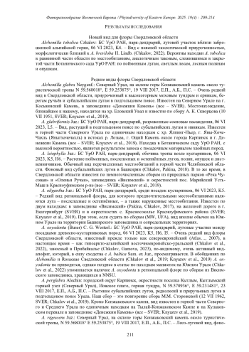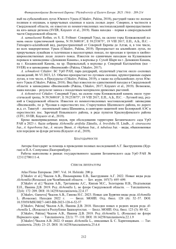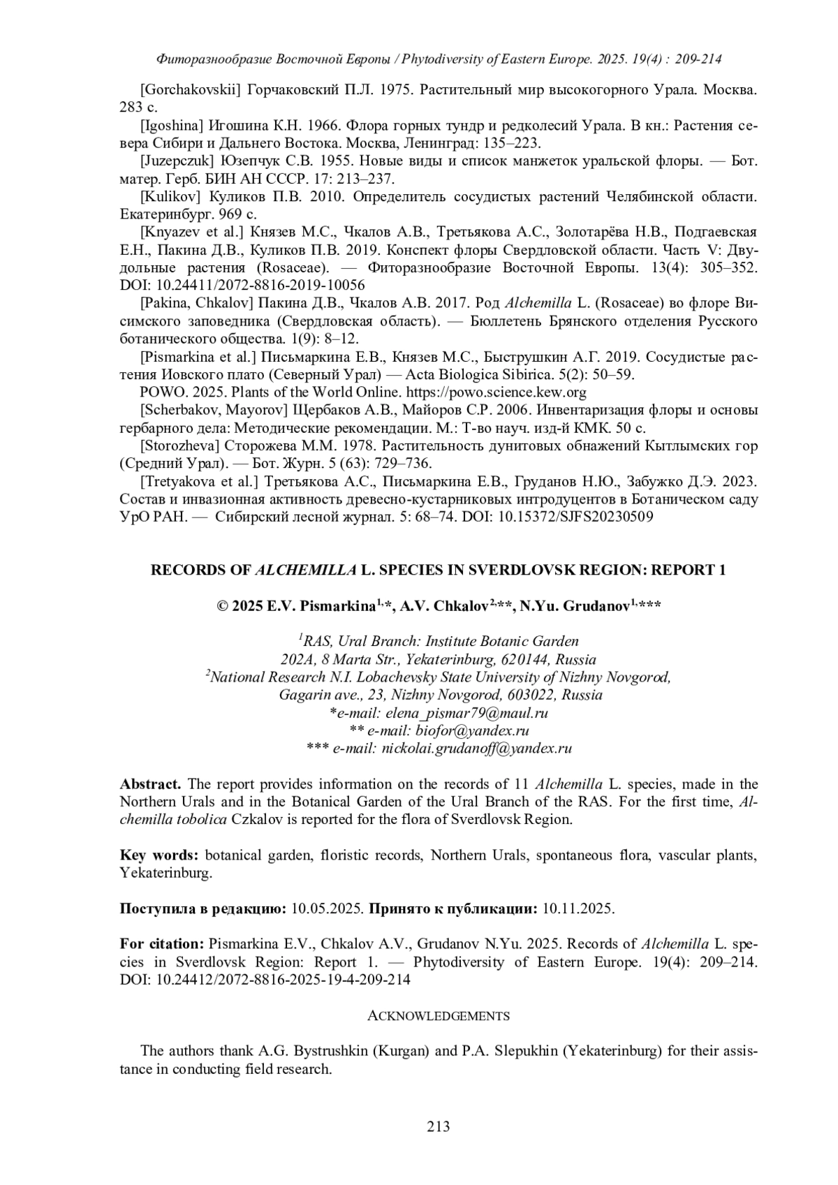 3. [Chkalov et al.] Чкалов А.В., Третьякова А.С., Князев М.С., Золотарева Н.В., Подгаевская Е.Н., Пакина Д.В. 2019. Род Alchemilla L. во флоре Свердловской области. - Turczaninowia. 22(4): 172-209. DOI: 10.14258/turczaninowia.22.4.17 EDN: KJPQPU