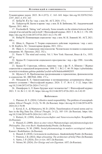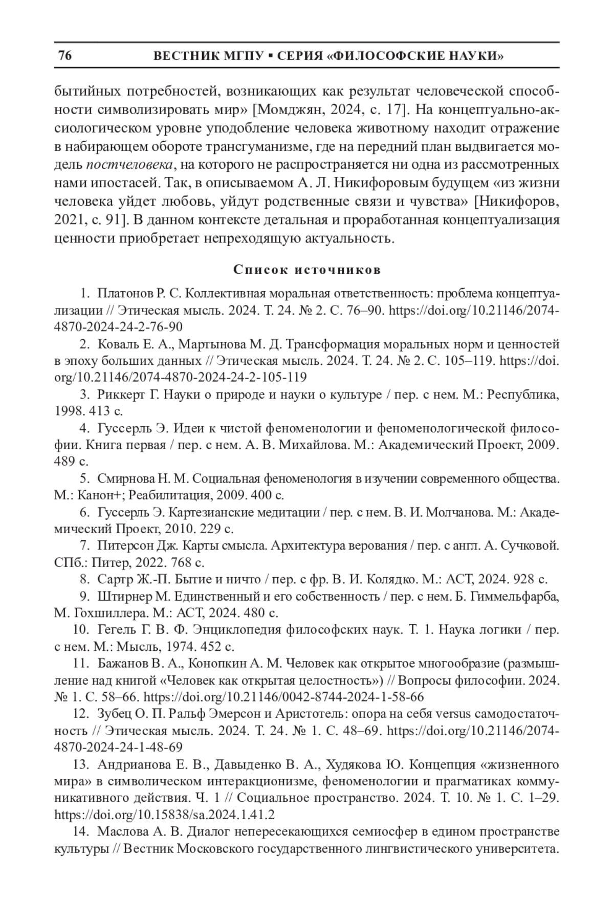 1. Платонов Р. С. Коллективная моральная ответственность: проблема концептуализации // Этическая мысль. 2024. Т. 24. № 2. С. 76-90. DOI: 10.21146/2074-4870-2024-24-2-76-90 EDN: QQJMTE