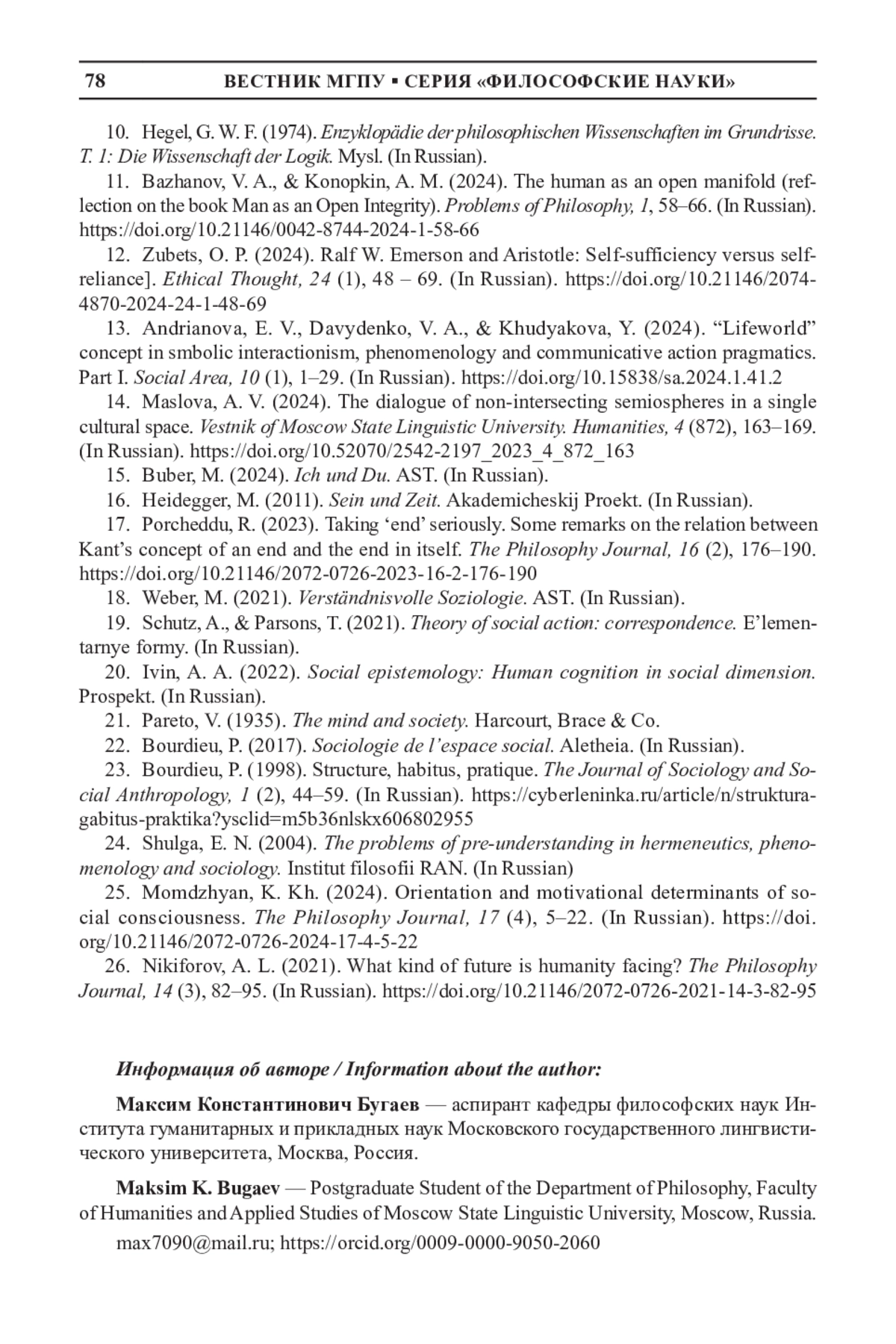 13. Андрианова Е. В., Давыденко В. А., Худякова Ю. Концепция “жизненного мира” в символическом интеракционизме, феноменологии и прагматиках коммуникативного действия. Ч. 1 // Социальное пространство. 2024. Т. 10. № 1. С. 1-29. DOI: 10.15838/sa.2024.L4L2 EDN: LLBDYI
