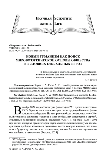 В ноябре 2024 года в Институте философии РАН прошли ежегодные XXIV Фроловские чтения, которые стали традицией нашего философского сообщества. На этот раз они были посвящены теме «Новый гуманизм: сохранить человека в мире глобальных опасностей и угроз». Известный российский философ, академик РАН И. Т. Фролов (1929–1999) при жизни выступал организатором науки, объединявшим лучшие умы для обсуждения проблем человека и гуманизма, всегда говорил и писал, что ключом к будущему являются не технологии, какими бы интеллектуальными они ни были, а сам человек [Фролов, 2025].