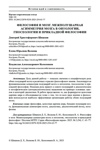 Цель данной работы - показать значение и специфическую роль обоих полушарий мозга в различных отраслях философского знания. Анализируется функциональная асимметрия полушарий мозга в онтологии, гносеологии и прикладной философии. Показана роль правого и левого полушарий в диалектическом и метафизическом (антидиалектическом) мышлении на примере основных законов и категорий диалектики. В работе представлено то, как формируется целостная картина мира и обосновывается тезис о том, что из всех наук именно в философии используется наиболее эффективная организация работы обоих полушарий мозга.