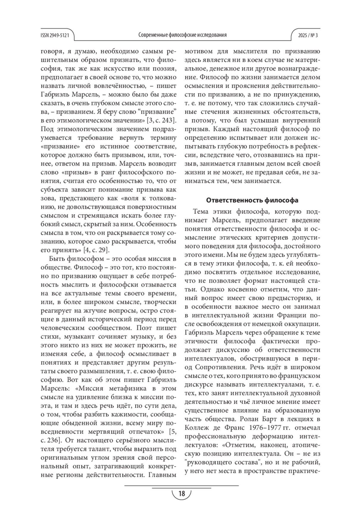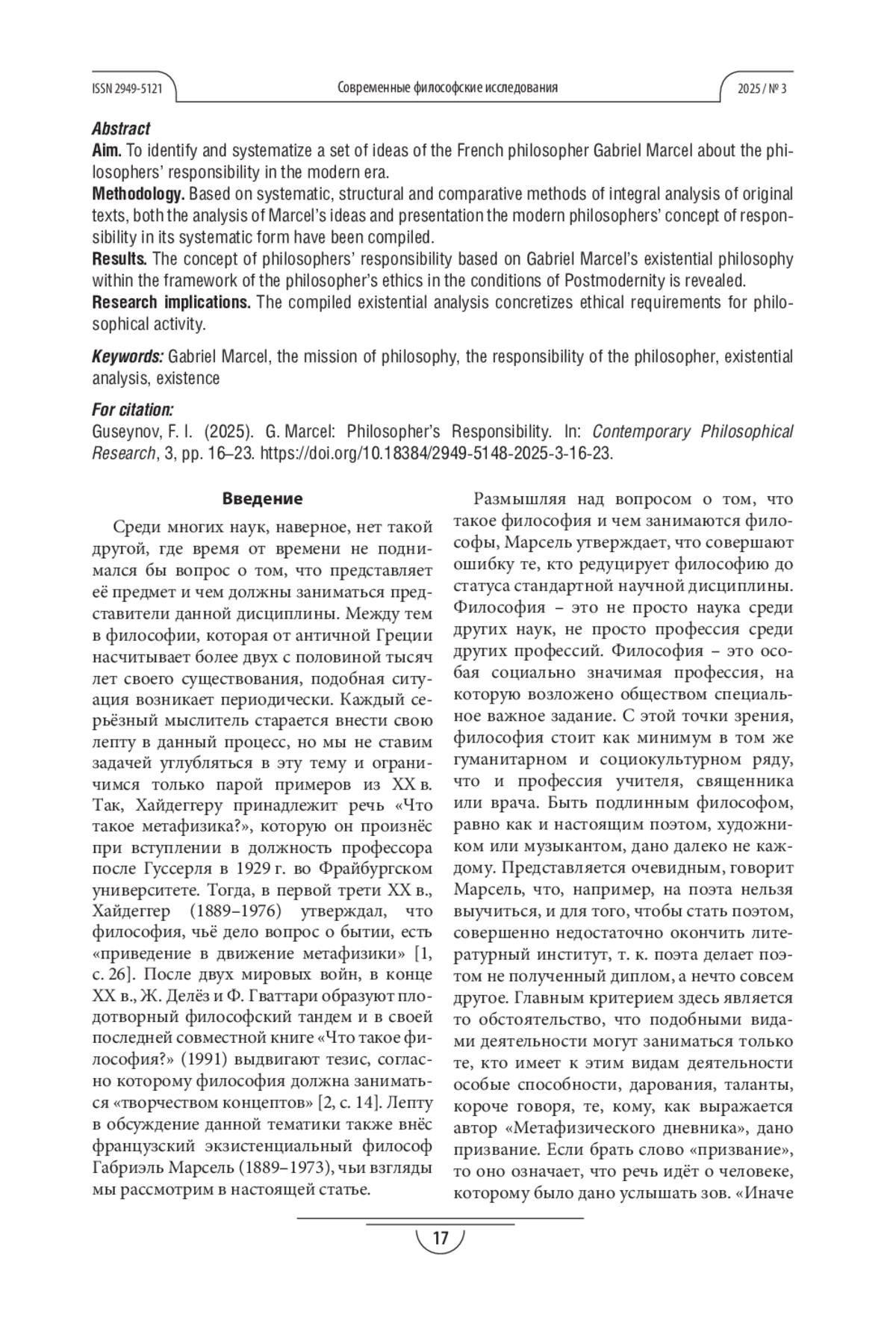 ГУСЕЙНОВ Ф. И. Г. МАРСЕЛЬ: ОТВЕТСТВЕННОСТЬ ФИЛОСОФА // СОВРЕМЕННЫЕ ФИЛОСОФСКИЕ ИССЛЕДОВАНИЯ. 2025. № 3