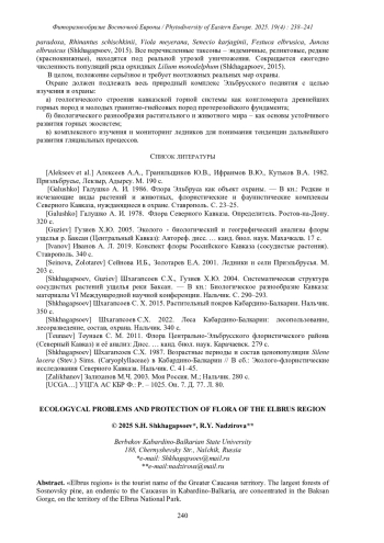 2. [Galushko] Галушко А. И. 1986. Флора Эльбруса как объект охраны. - В кн.: Редкие и исчезающие виды растений и животных, флористические и фаунистические комплексы Северного Кавказа, нуждающиеся в охране. Ставрополь. С. 23-25.