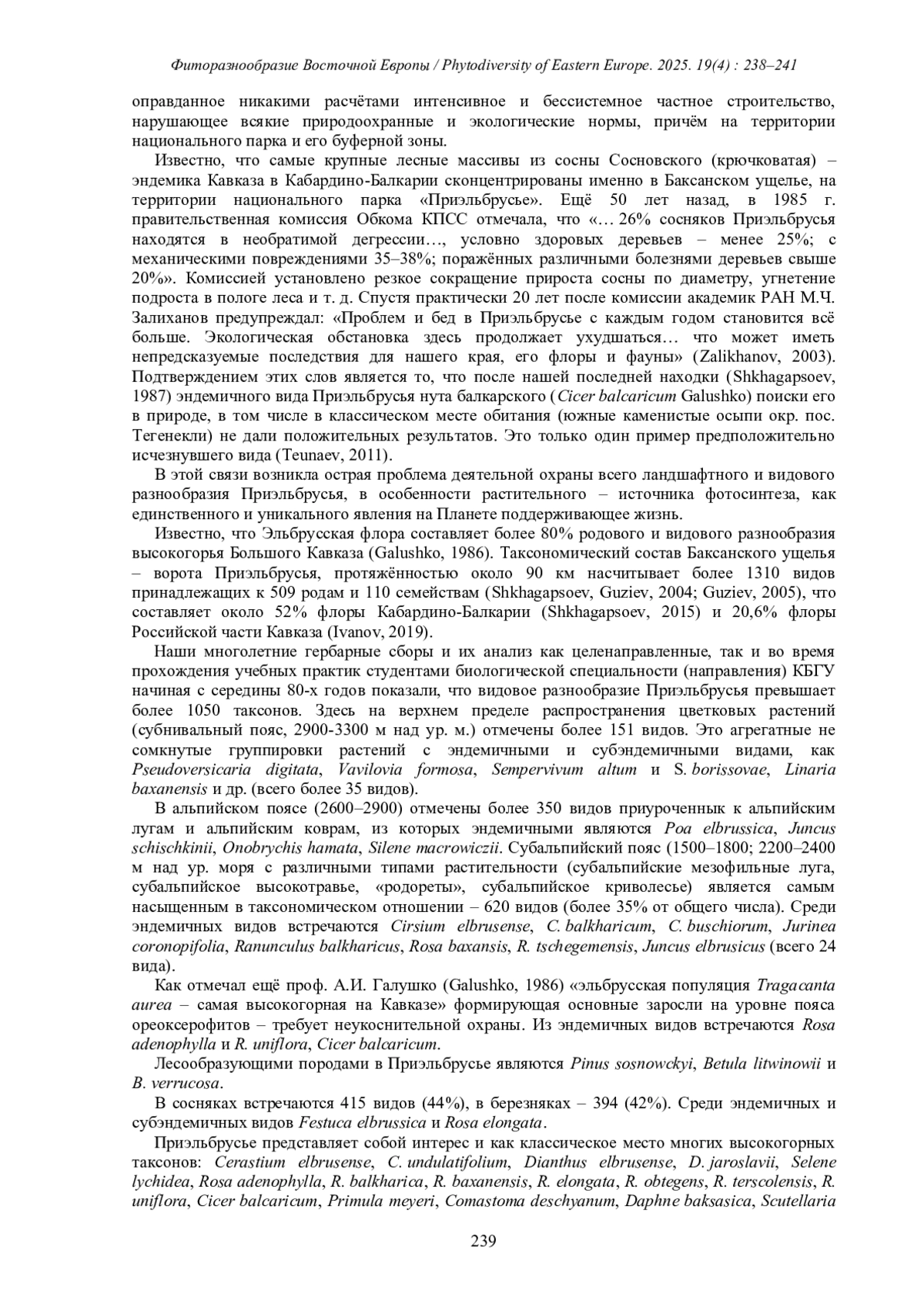 Известно, что самые крупные лесные массивы из сосны Сосновского (крючковатая) – эндемика Кавказа в Кабардино-Балкарии сконцентрированы именно в Баксанском ущелье, на территории национального парка «Приэльбрусье». Ещё 50 лет назад, в 1985 г. правительственная комиссия Обкома КПСС отмечала, что «… 26% сосняков Приэльбрусья находятся в необратимой дегрессии…, условно здоровых деревьев – менее 25%; с механическими повреждениями 35–38%; поражённых различными болезнями деревьев свыше 20%». Комиссией установлено резкое сокращение прироста сосны по диаметру, угнетение подроста в пологе леса и т. д. Спустя практически 20 лет после комиссии академик РАН М. Ч. Залиханов предупреждал: «Проблем и бед в Приэльбрусье с каждым годом становится всё больше. Экологическая обстановка здесь продолжает ухудшаться… что может иметь непредсказуемые последствия для нашего края, его флоры и фауны» (Zalikhanov, 2003). Подтверждением этих слов является то, что после нашей последней находки (Shkhagapsoev, 1987) эндемичного вида Приэльбрусья нута балкарского (Cicer balcaricum Galushko) поиски его в природе, в том числе в классическом месте обитания (южные каменистые осыпи окр. пос. Тегенекли) не дали положительных результатов. Это только один пример предположительно исчезнувшего вида (Teunaev, 2011).