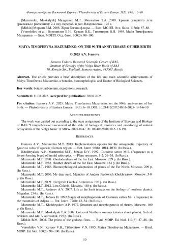 14. [Voroshilov et al.] Ворошилов В.Н., Куваев В.Б., Тихомиров В.Н. 1995. Майя Тимофеевна Мазуренко. - Бюл. МОИП. Отд. биол. 100(3): 98-100.