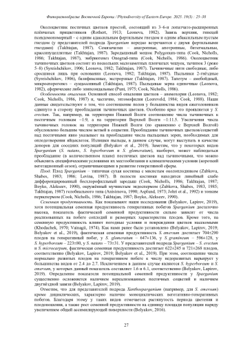 17. Bobrov A.A., Volkova P.A., Mochalova O.A., Chemeris E.V. 2023. High diversity of aquatic Sparganium (Xanthosparganium, Typhaceae) in North Eurasia is mostly explained by recurrent hybridization. - Perspect. Plant Ecol. Evol. Syst. 60: 125746. DOI: 10.1016/j.ppees.2023.125746 EDN: GOWTLI