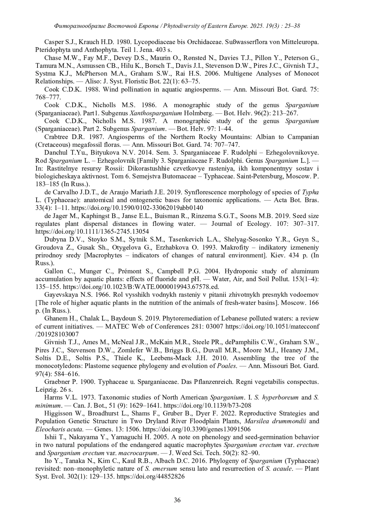 10. [Belyakov et al.] Беляков Е.А., Лапиров А.Г., Кособокова С.Р., Стрелков С.П., Кананыхина Е.В. 2019. Некоторые аспекты биологии Sparganium erectum L. (Typhaceae) на территории Астраханской области. - В кн.: Сб. матер. Междунар. науч.-практ. конф. “Пойменные и дельтовые биоценозы голарктики: биологическое разнообразие, экология и эволюция”. Астрахань. С. 20-27. EDN: HSTVGM