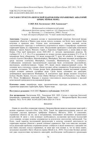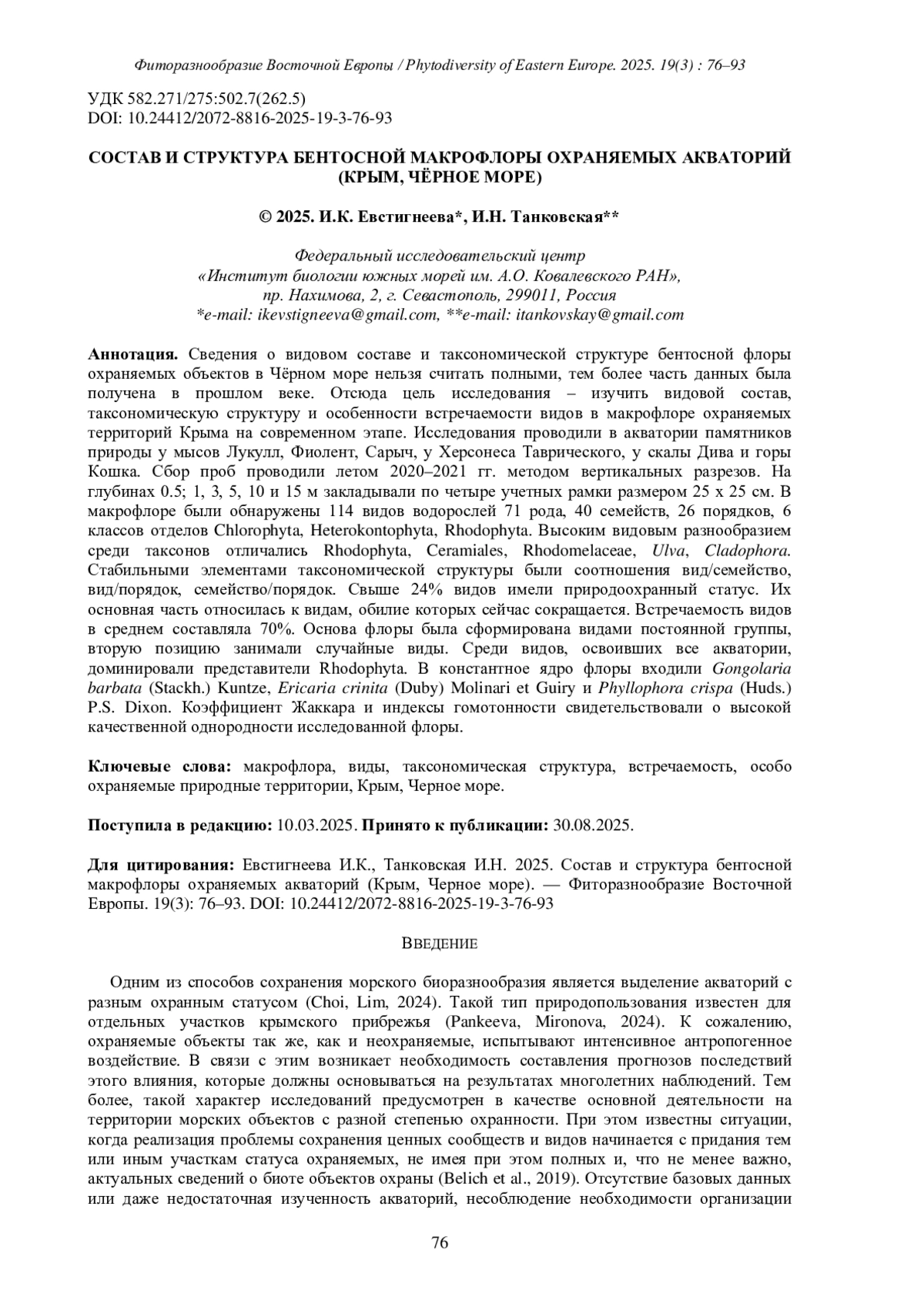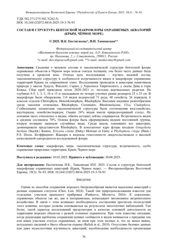 12. [Evstigneeva, Tankovskaya] Евстигнеева И.К., Танковская И.Н. 2024а. Таксономическое разнообразие бентосной альгофлоры у западного берега Крымского полуострова. - Бюллетень Московского общества испытателей природы. Отдел биологический. 129(1): 54-70. EDN: ANGTOK