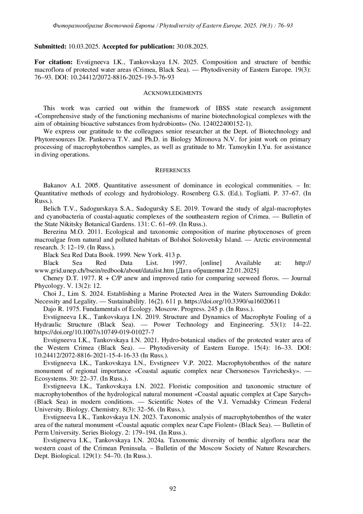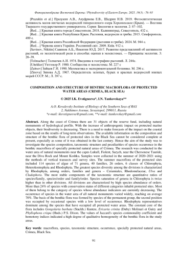 9. [Evstigneeva et al.] Евстигнеева И.К., Танковская И.Н., Евстигнеев В.П. 2022. Макрофитобентос памятника природы регионального значения “Прибрежный аквальный комплекс у Херсонеса Таврического”. - Экосистемы. 30: 22-37.