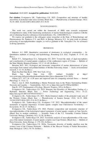 8. [Evstigneeva, Tankovskaya] Евстигнеева И.К., Танковская И.Н. 2021. Гидроботанические исследования охраняемой акватории Западного Крыма (Черное море). - Фиторазнообразие Восточной Европы. 15(4): 16-33. DOI: 10.24412/2072-8816-2021-15-4-16-33 EDN: KBBFGT