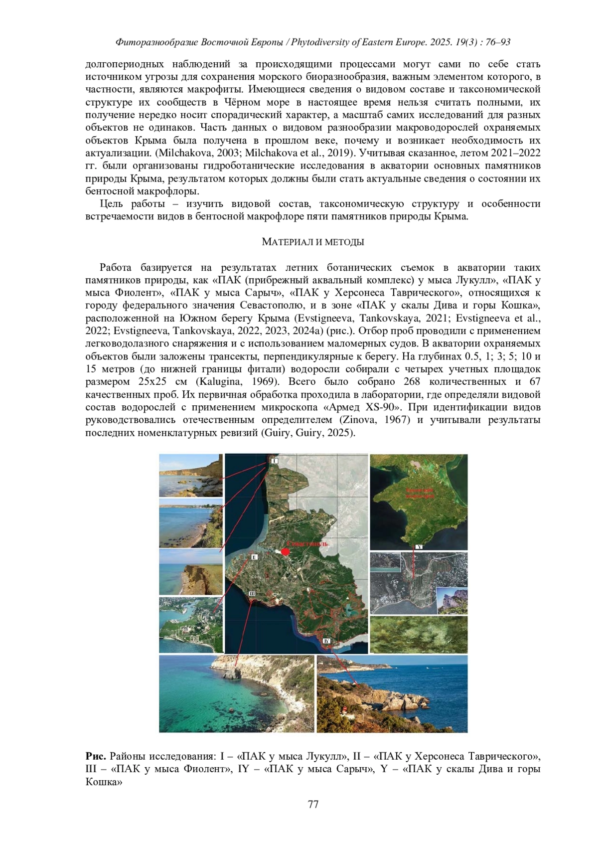 Работа базируется на результатах летних ботанических съемок в акватории таких памятников природы, как «ПАК (прибрежный аквальный комплекс) у мыса Лукулл», «ПАК у мыса Фиолент», «ПАК у мыса Сарыч», «ПАК у Херсонеса Таврического», относящихся к городу федерального значения Севастополю, и в зоне «ПАК у скалы Дива и горы Кошка», расположенной на Южном берегу Крыма (Evstigneeva, Tankovskaya, 2021; Evstigneeva et al., 2022; Evstigneeva, Tankovskaya, 2022, 2023, 2024a) (рис.). Отбор проб проводили с применением легководолазного снаряжения и с использованием маломерных судов. В акватории охраняемых объектов были заложены трансекты, перпендикулярные к берегу. На глубинах 0.5, 1; 3; 5; 10 и 15 метров (до нижней границы фитали) водоросли собирали с четырех учетных площадок размером 25х25 см (Kalugina, 1969). Всего было собрано 268 количественных и 67 качественных проб. Их первичная обработка проходила в лаборатории, где определяли видовой состав водорослей с применением микроскопа «Армед XS-90». При идентификации видов руководствовались отечественным определителем (Zinova, 1967) и учитывали результаты последних номенклатурных ревизий (Guiry, Guiry, 2025).