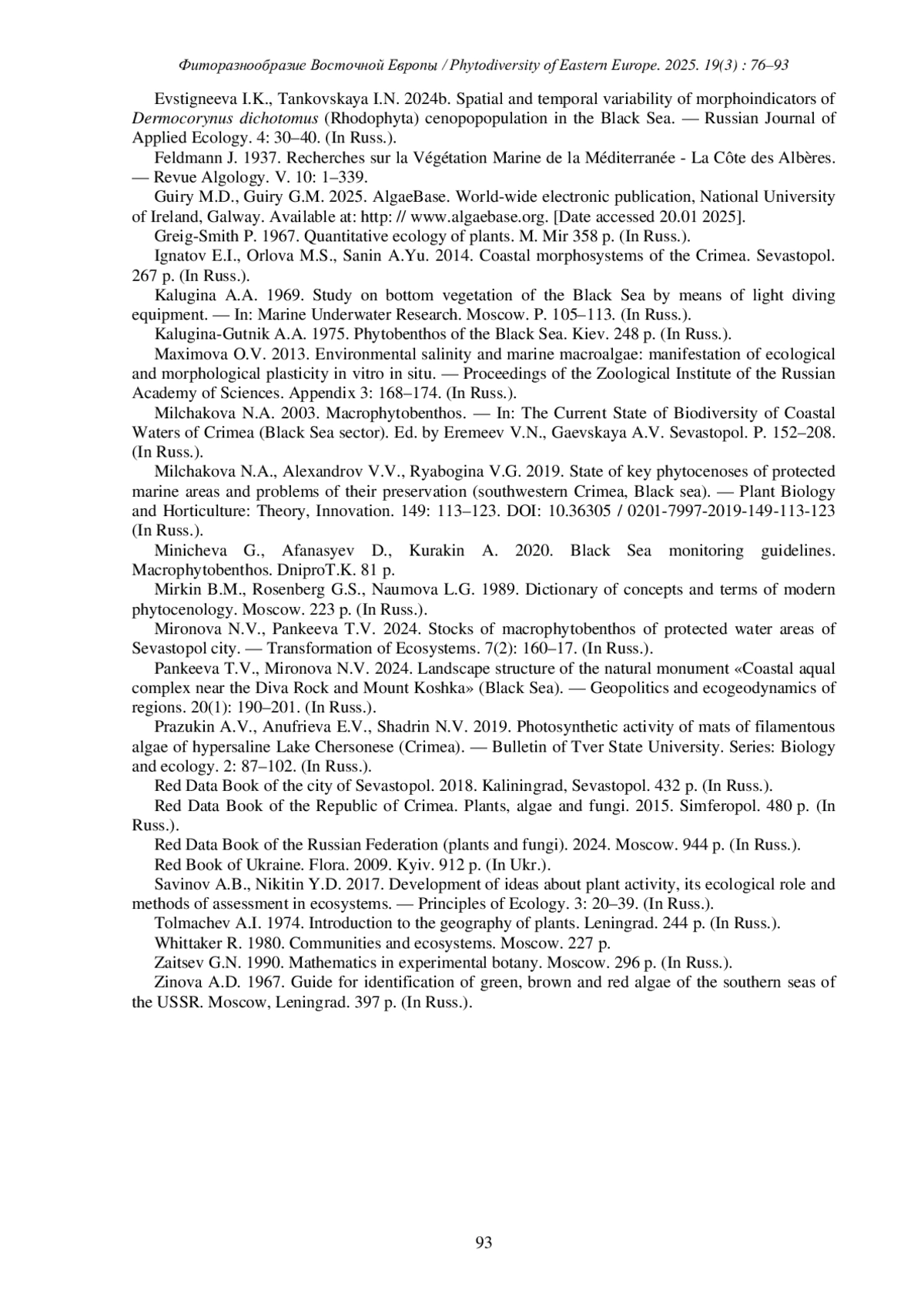 13. [Evstigneeva, Tankovskaya] Евстигнеева И.К., Танковская И.Н. 2024b. Пространственно-временная вариабельность морфопоказателей ценопопуляции Dermocorynus dichotomus (Rhodophyta) в Чёрном море. - Российский журнал прикладной экологии. 4: 30-40. EDN: EPMPKA