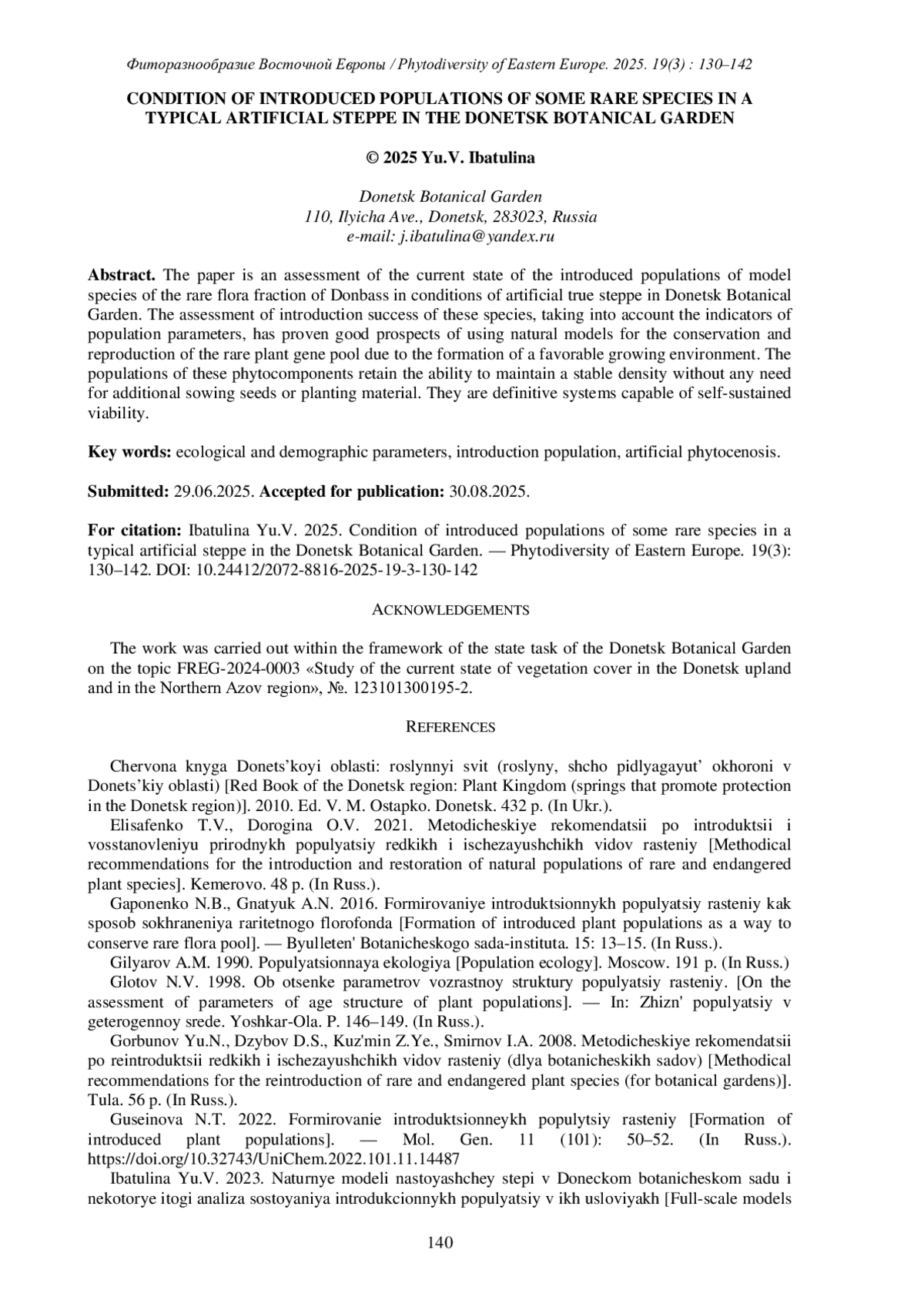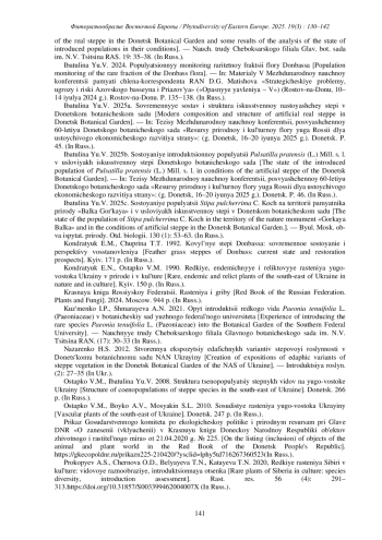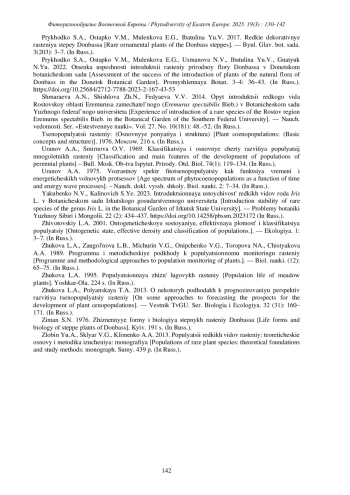 24. [Prykhodko et al.] Приходько С.А., Остапко В.М., Муленкова Е.Г., Усманова Н.В., Ибатулина Ю.В., Гнатюк Н.Ю. 2022. Оценка успешности интродукции растений природной флоры Донбасса в Донецком ботаническом саду. - Промышленная бот. 3-4: 36-43. DOI: 10.25684/2712-7788-2023-2-167-43-53