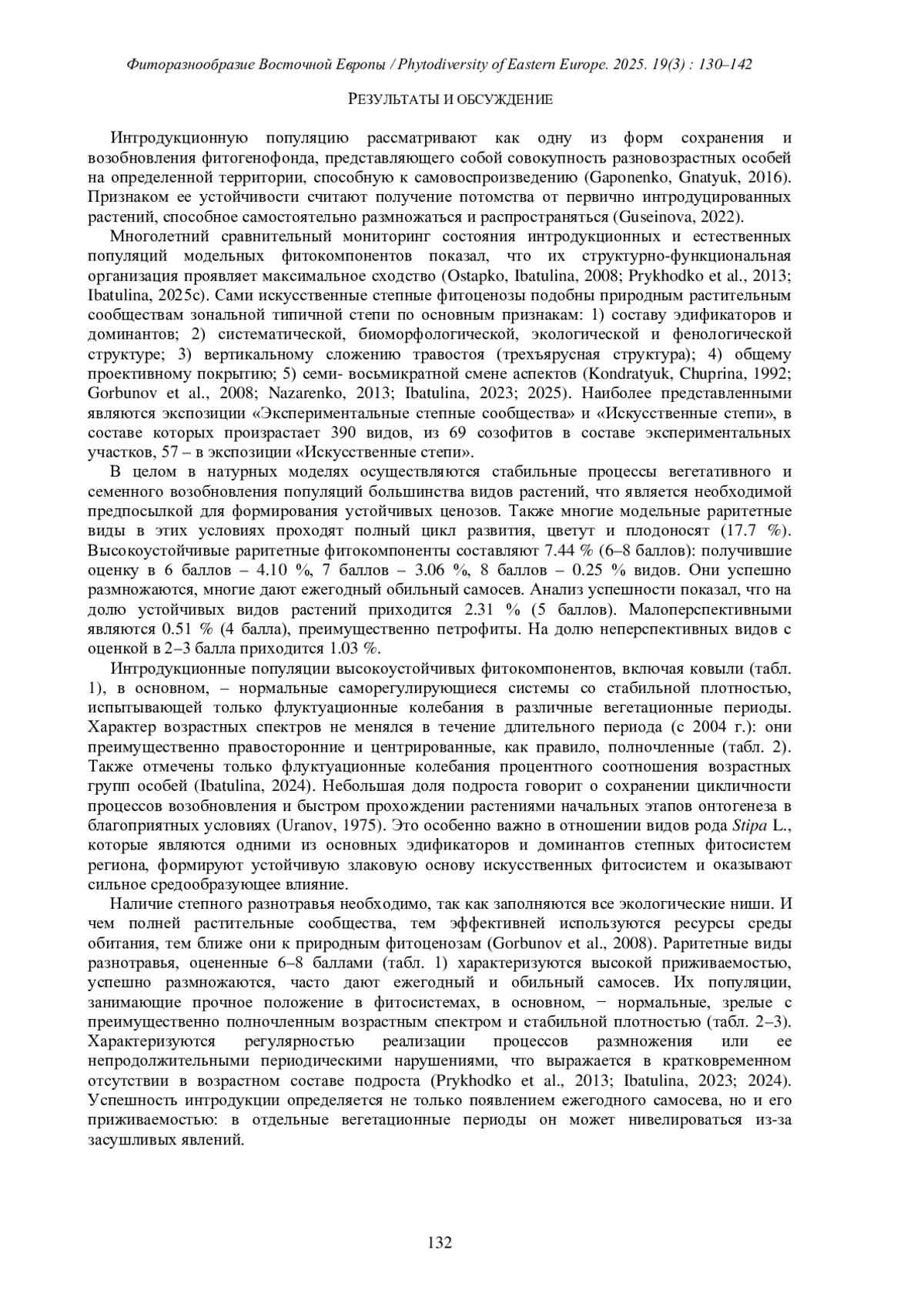 12. [Ibatulina] Ибатулина Ю.В. 2025с. Состояние популяции Stipa pulcherrima C. Koch на территории памятника природы “Балка Горькая” и в условиях искусственной степи в Донецком ботаническом саду. - Бюл. Моск. об-ва исп. природы. Отд. биол. 130 (1): 53-63. EDN: QITPOL