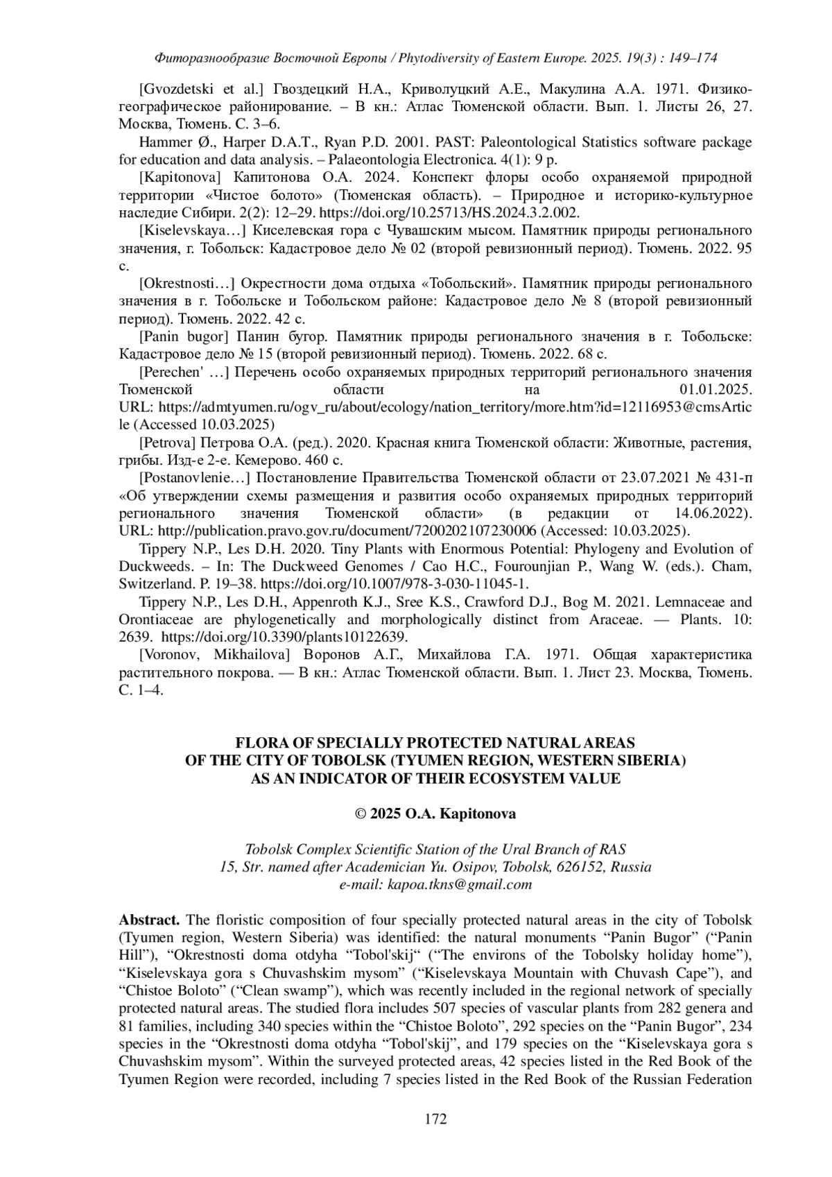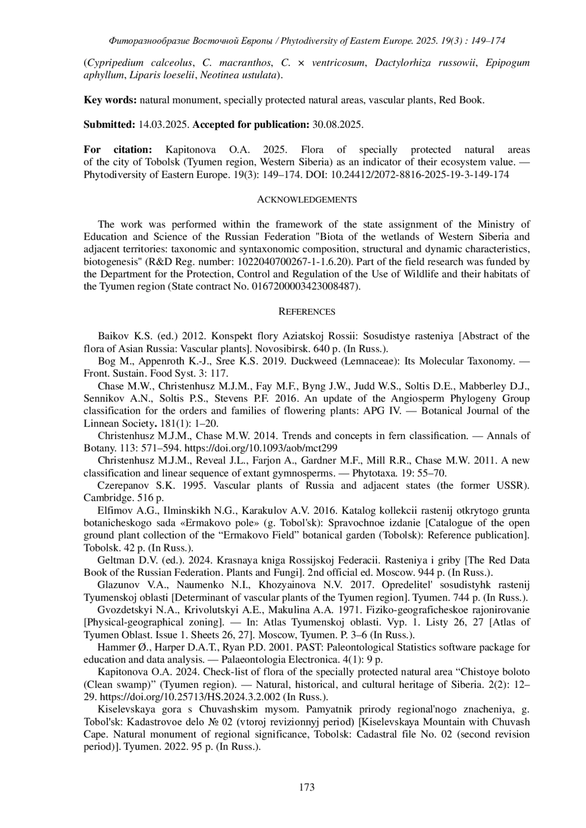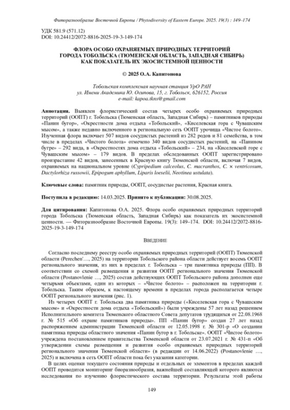 12. [Kapitonova] Капитонова О.А. 2024. Конспект флоры особо охраняемой природной территории “Чистое болото” (Тюменская область). - Природное и историко-культурное наследие Сибири. 2(2): 12-29. DOI: 10.25713/HS.2024.3.2.002 EDN: TWRMXY