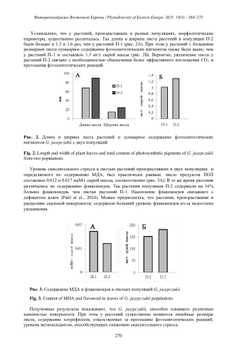 Петрофиты или литофиты – растения, приспособленные произрастать на каменистых субстратах: на скалах, осыпях, галечниках, щебнистых местах, ледниковых моренах, эродированных склонах (Golubev, Golubeva, 1992; Kovaleva, 2013). Они широко распространены во всех горных системах и характеризуются богатым видовым составом (Boronina, Korolev, 2018; Grechushkina, 2011). Экологические особенности местообитаний петрофитов отличаются не только специфичностью почвенного субстрата, но климатическими и микроклиматическими условиями (резкими перепадами температур, сильными ветрами, высокой освещенностью, водным дефицитом) (Golub et al., 2009; Nurmatov, 2024). Как правило, у многих растений наблюдается наличие мелких, густо опушенных листьев с восковым покрытием или толстой кутикулой, что способствует снижению транспирационных потерь. Известно, что морфологические признаки листа, такие как длина, ширина, площадь, связанны с условиями среды (Schrader et al., 2021). Размер листьев напрямую связан с терморегуляцией и, следовательно, с фотосинтезом, транспирацией и дыханием (Leigh et al., 2017). Эффективность работы фотосинтетического аппарата зависит от содержания пигментов, обеспечивающих адсорбцию квантов света, а изменения их состава влияет на фотосинтетическую продуктивность растений (Sherin et al., 2022).