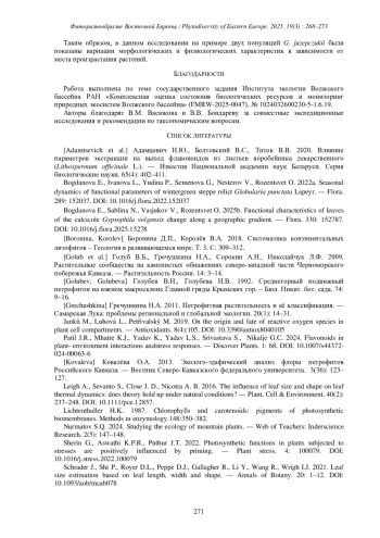 9. Patil J.R., Mhatre K.J., Yadav K., Yadav L.S., Srivastava S., Nikalje G.C. 2024. Flavonoids in plant- environment interactions andstress responses. - Discover Plants. 1: 68. DOI: 10.1007/s44372-024-00063-6 EDN: KEMPGZ