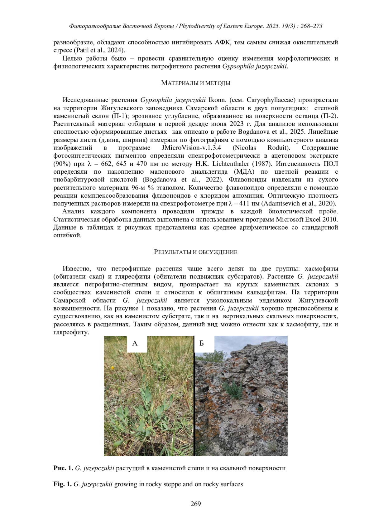 Приведено сравнительное исследование морфологических и физиологических характеристик петрофитного растения Gypsophila juzepczukii Ikonn. (Caryophyllaceae), произраставшего в разных популяциях на территории Жигулевского заповедника Самарской области. Выявлено, что G. juzepczukii хорошо приспособлен к существованию, как на каменистом субстрате (П-1), так и на вертикальных скальных поверхностях (П-2). При этом у растений П-2 отмечали большую длину и ширину листа, содержание фотосинтетических пигментов, а также антиоксидантов. Таким образом, в данном исследовании на примере двух популяций G. juzepczukii были показаны вариации морфологических и физиологических характеристик в зависимости от места произрастаний растений.