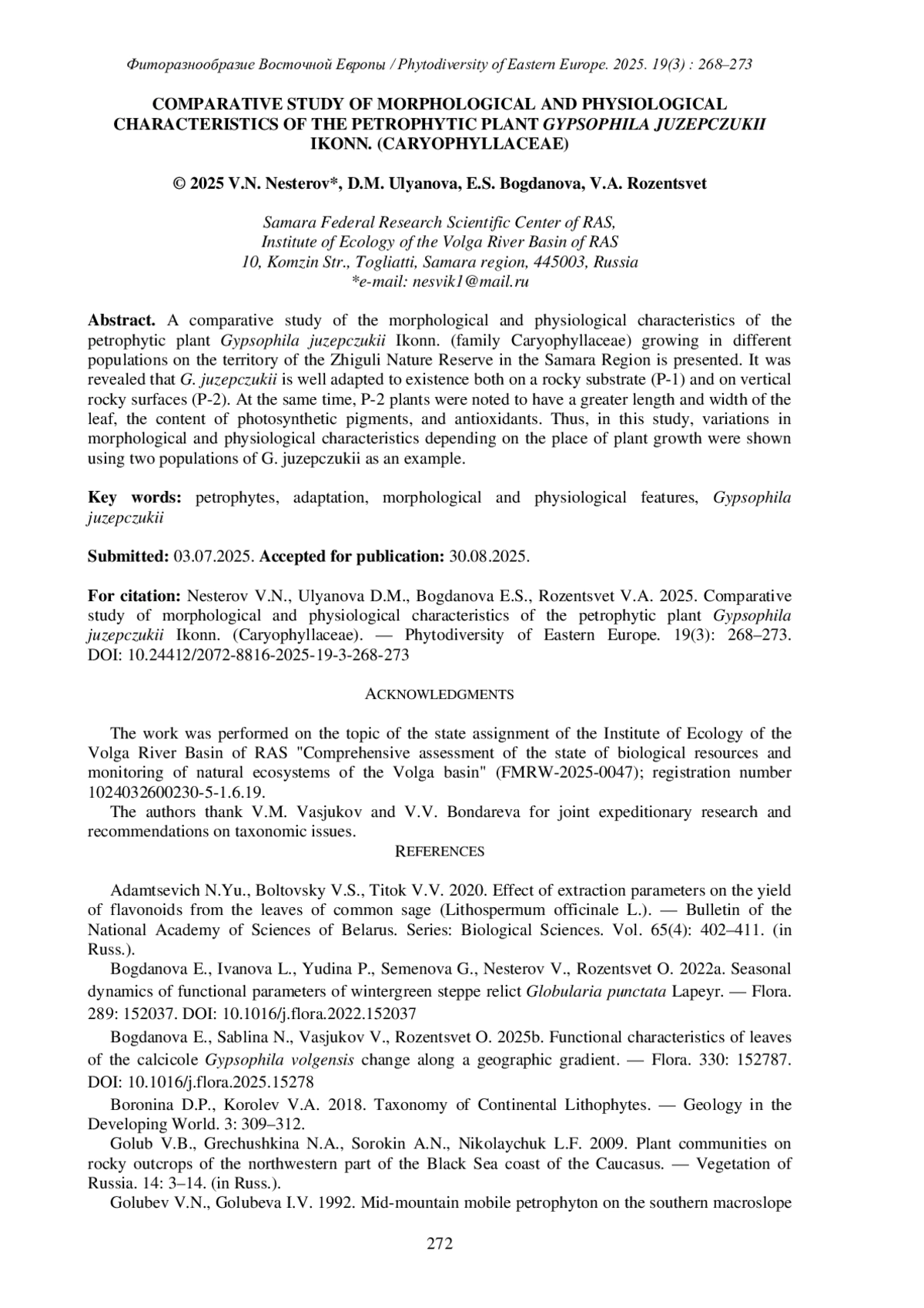 3. Bogdanova E., Sablina N., Vasjukov V., Rozentsvet O. 2025b. Functional characteristics of leaves of the calcicole Gypsophila volgensis change along a geographic gradient. - Flora. 330: 152787. DOI: 10.1016/j.flora.2025.15278