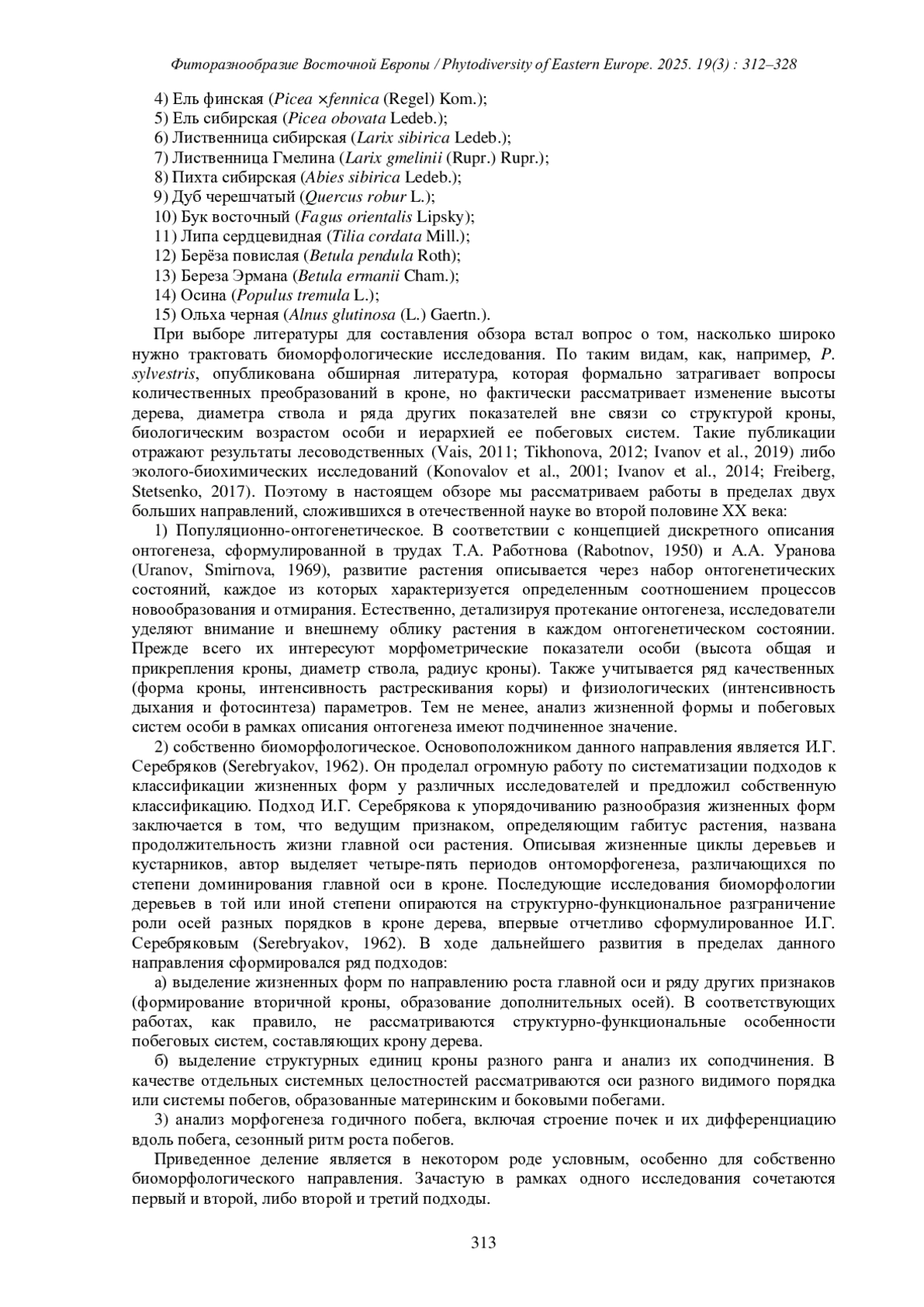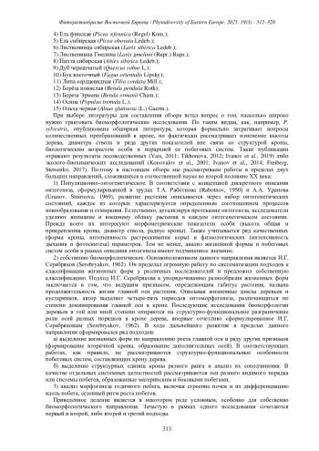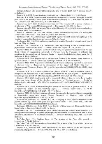 38. [Kostina et al.] Костина М.В., Барабанщикова Н.С., Недосеко О.И., Стаменов М.Н. 2024a. Конструктивная организация кроны лесообразующих видов деревьев средней полосы Европейской России. - Бот. журн. 109(5): 460-475. DOI: 10.31857/S0006813624050042