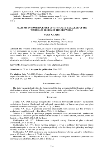 18. [Sytin et al.] Сытин А. К., Рязанова Л. В., Сластунов Д.Д. 2020. Об архитектурных моделях однолетних астрагалов (Astragalus L., Fabaceae). - Сиб. экол. журн. 3: 310-321. DOI: 10.15372/SEJ20200305