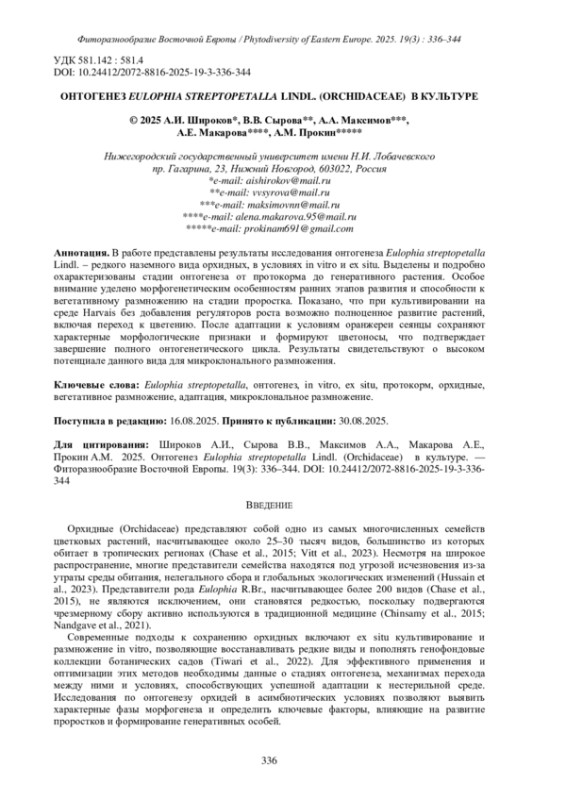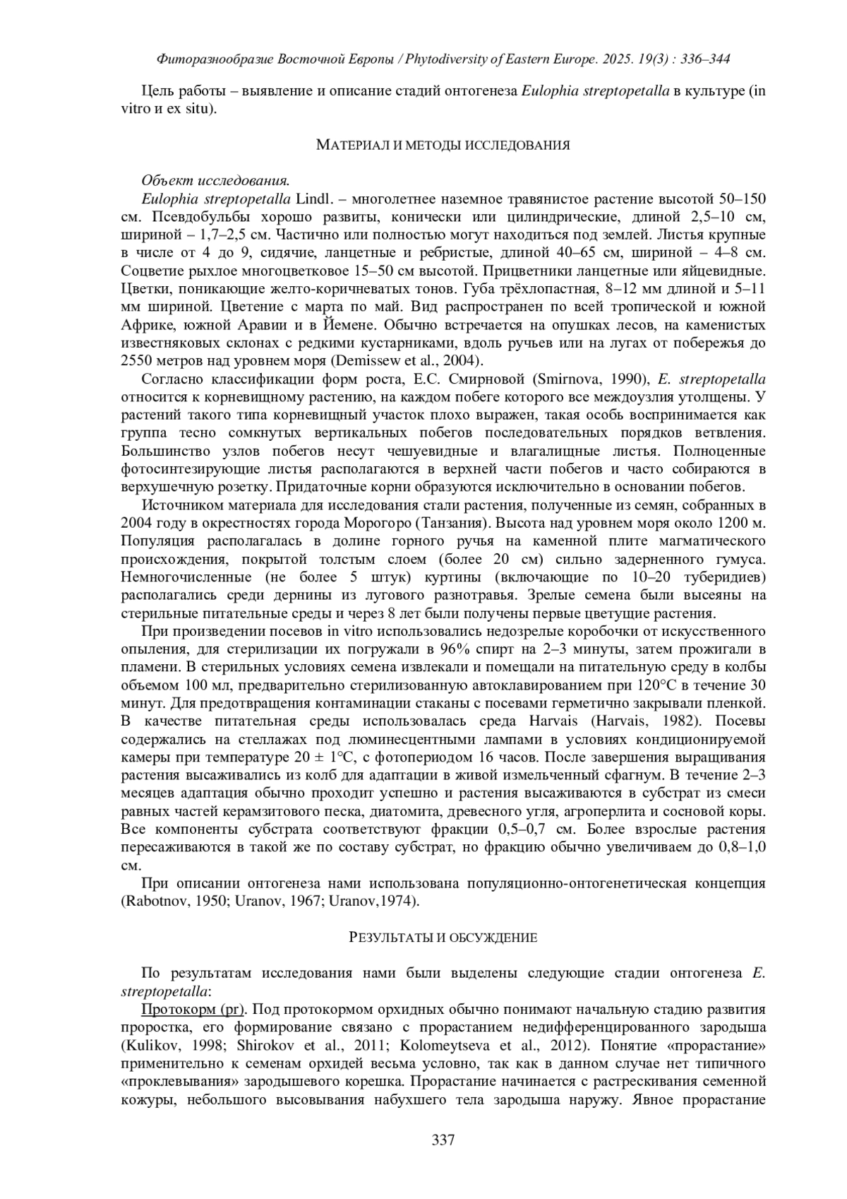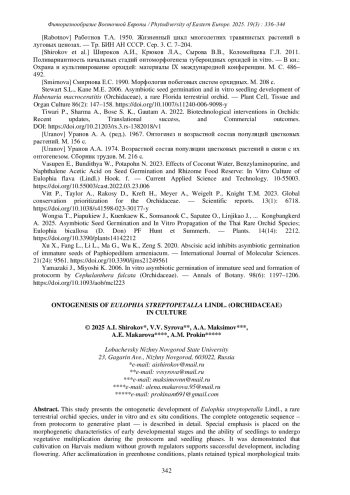 В работе представлены результаты исследования онтогенеза Eulophia streptopetalla Lindl. - редкого наземного вида орхидных, в условиях in vitro и ex situ. Выделены и подробно охарактеризованы стадии онтогенеза от протокорма до генеративного растения. Особое внимание уделено морфогенетическим особенностям ранних этапов развития и способности к вегетативному размножению на стадии проростка. Показано, что при культивировании на среде Harvais без добавления регуляторов роста возможно полноценное развитие растений, включая переход к цветению. После адаптации к условиям оранжереи сеянцы сохраняют характерные морфологические признаки и формируют цветоносы, что подтверждает завершение полного онтогенетического цикла. Результаты свидетельствуют о высоком потенциале данного вида для микроклонального размножения.