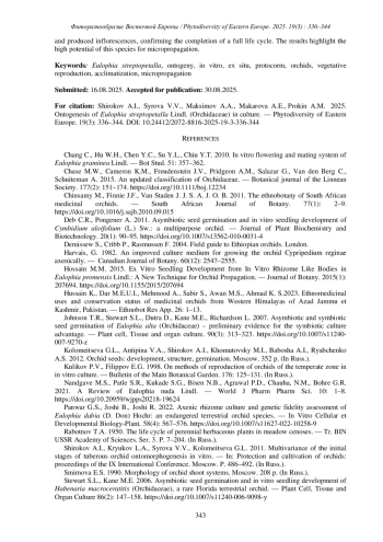 6. Hossain M.M. 2015. Ex Vitro Seedling Development from In Vitro Rhizome Like Bodies in Eulophia promensis Lindl.: A New Technique for Orchid Propagation. - Journal of Botany. 2015(1): 207694. DOI: 10.1155/2015/207694