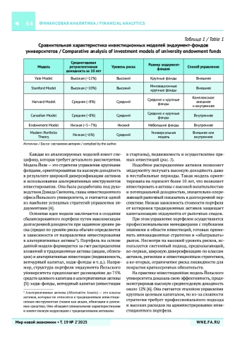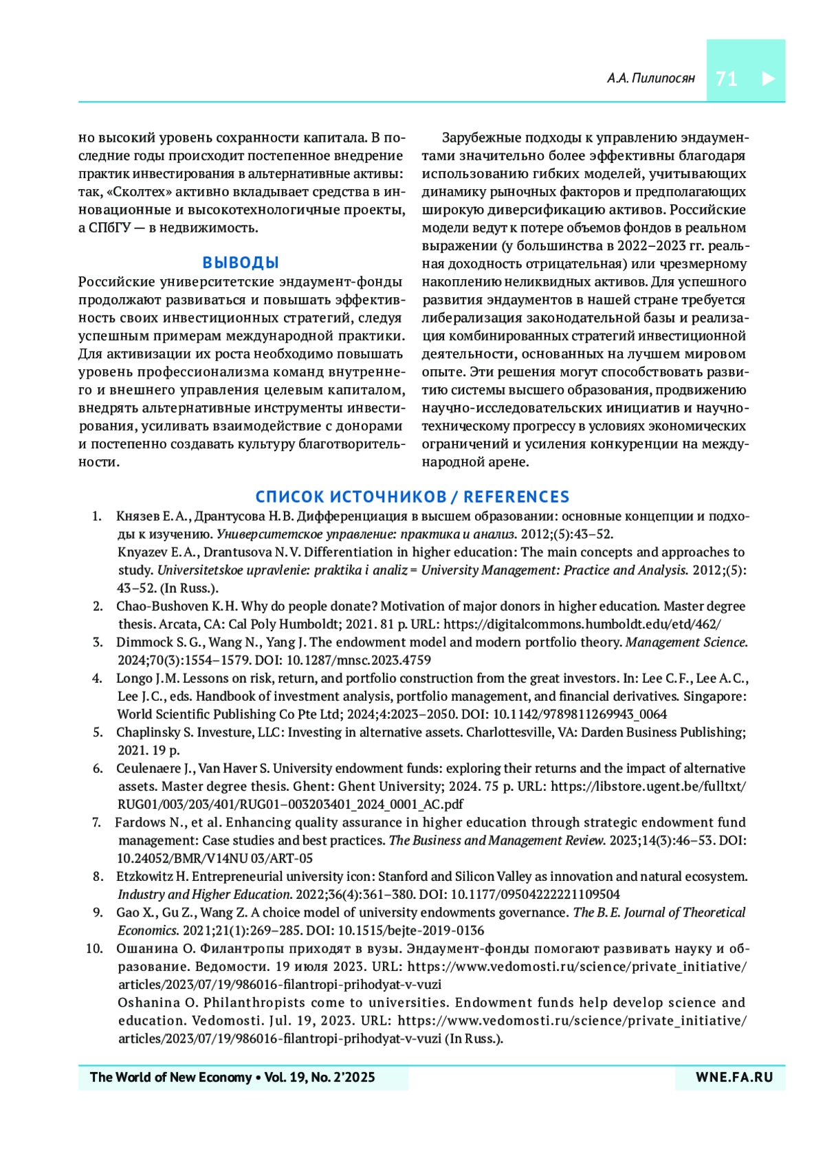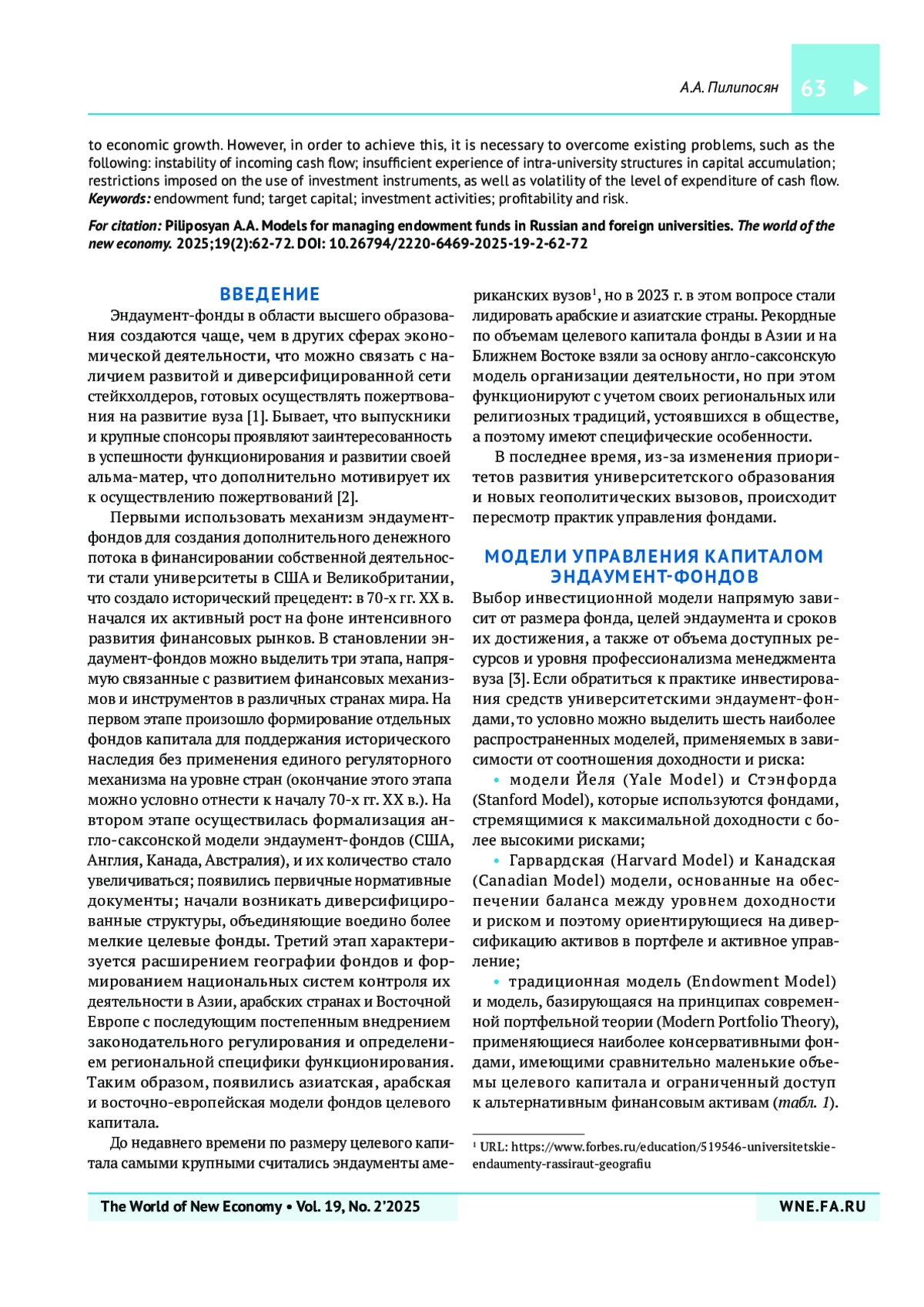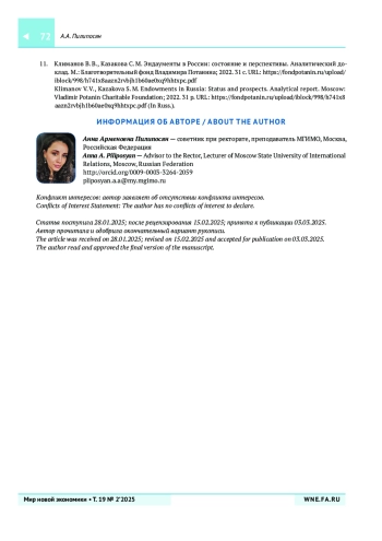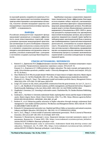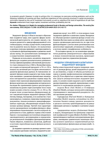 ПИЛИПОСЯН А. А. МОДЕЛИ УПРАВЛЕНИЯ ЦЕЛЕВЫМ КАПИТАЛОМ В РОССИЙСКИХ И ЗАРУБЕЖНЫХ УНИВЕРСИТЕТАХ // МИР НОВОЙ ЭКОНОМИКИ. 2025. ТОМ 19, № 2