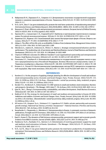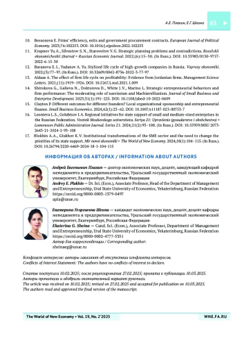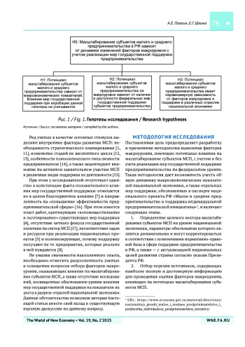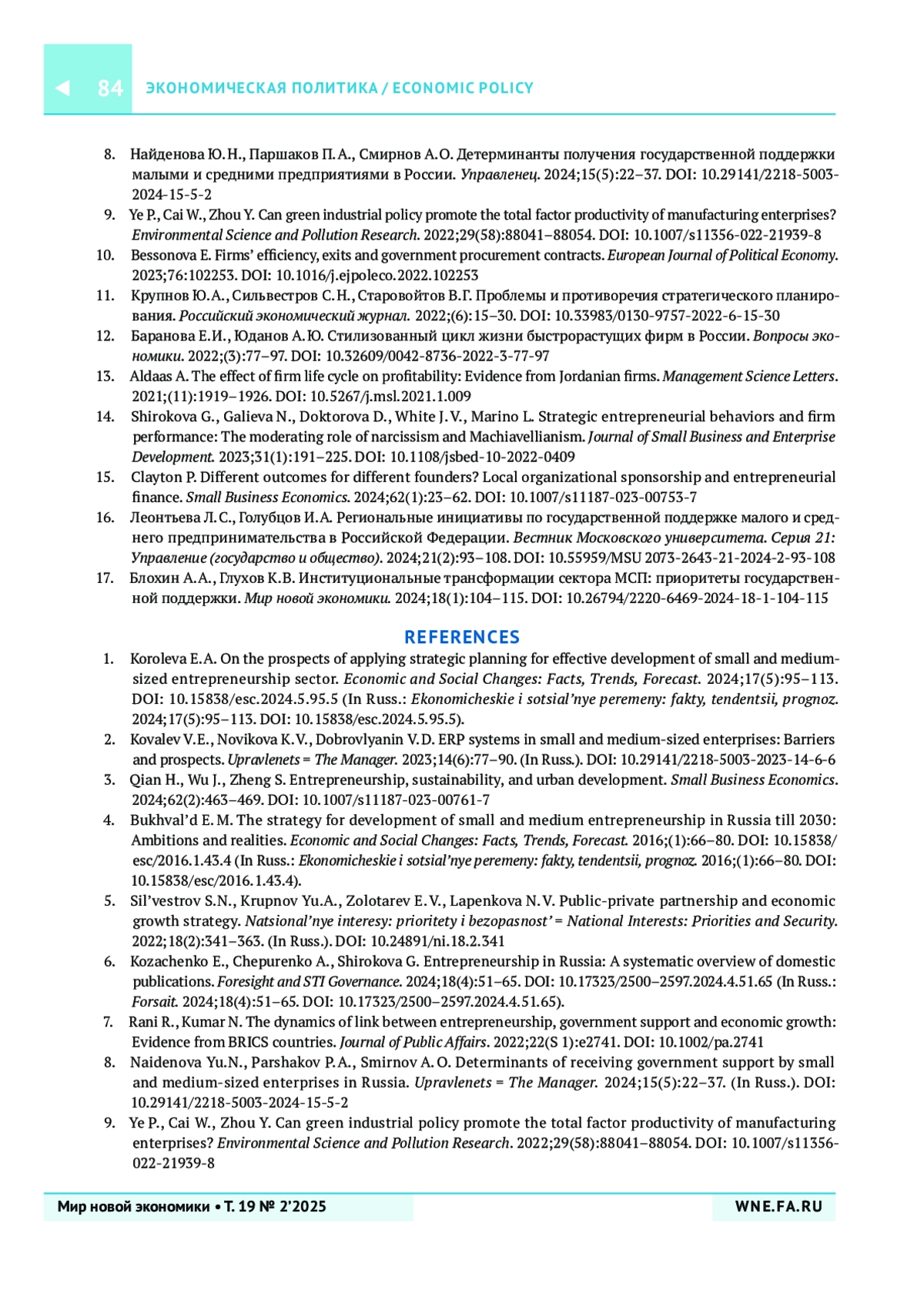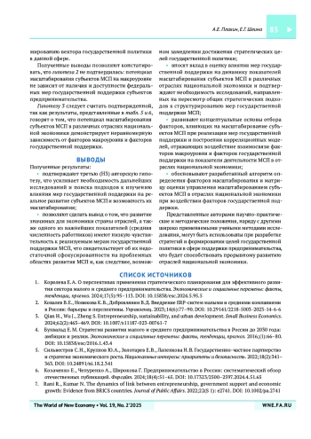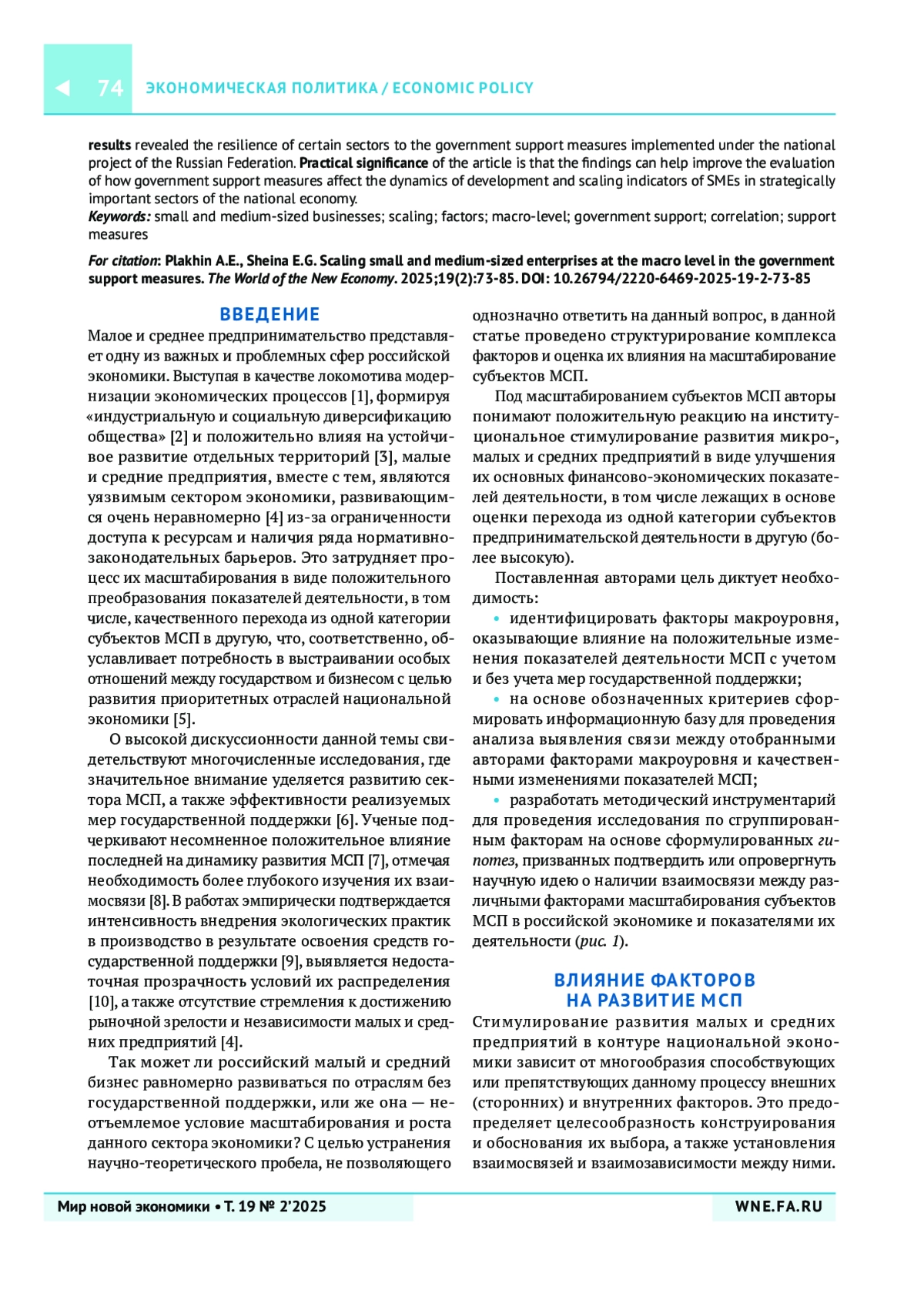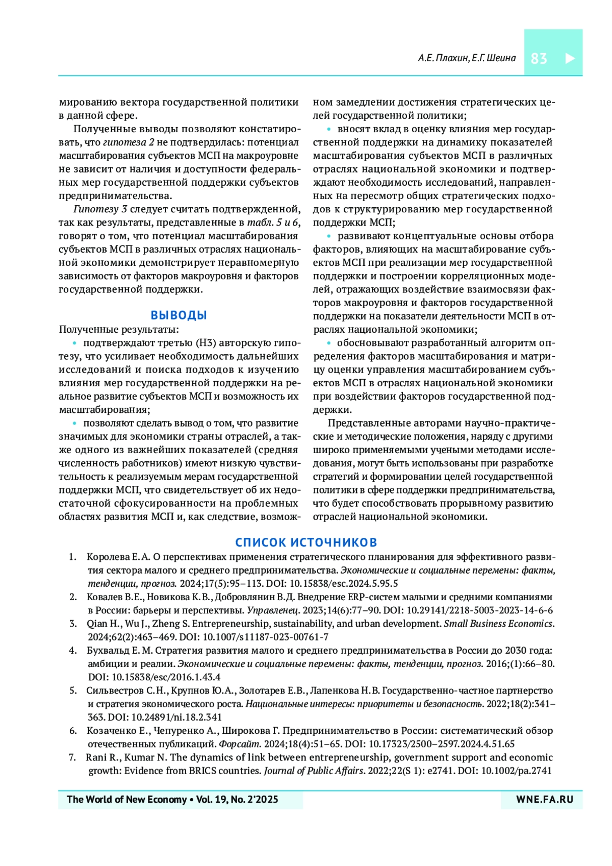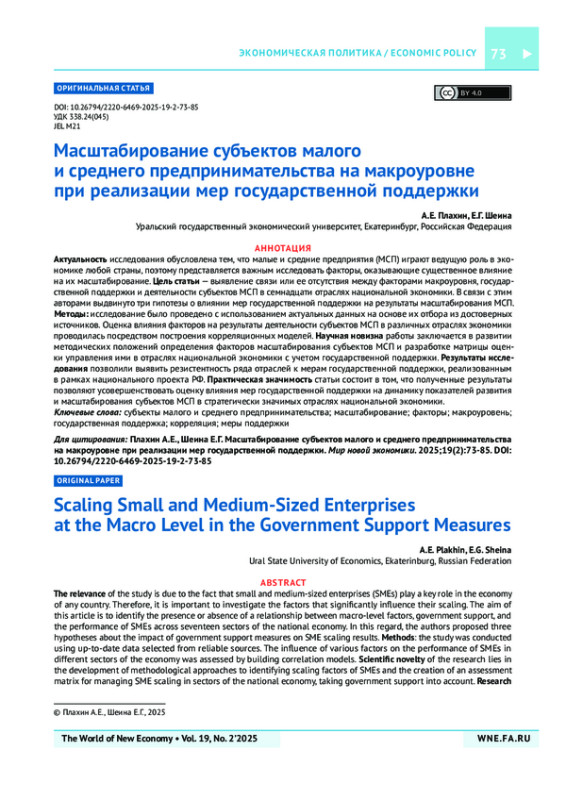 ПЛАХИН А. Е., ШЕИНА Е. Г. МАСШТАБИРОВАНИЕ СУБЪЕКТОВ МАЛОГО И СРЕДНЕГО ПРЕДПРИНИМАТЕЛЬСТВА НА МАКРОУРОВНЕ ПРИ РЕАЛИЗАЦИИ МЕР ГОСУДАРСТВЕННОЙ ПОДДЕРЖКИ // МИР НОВОЙ ЭКОНОМИКИ. 2025. ТОМ 19, № 2