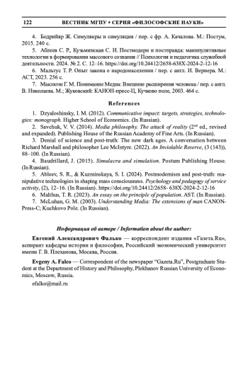 5. Аблеев С. Р., Кузьминская С. И. Постмодерн и постправда: манипулятивные технологии в формировании массового сознания // Психология и педагогика служебной деятельности. 2024. № 2. С. 12-16. DOI: 10.24412/2658-638X-2024-2-12-16 EDN: BXELJF