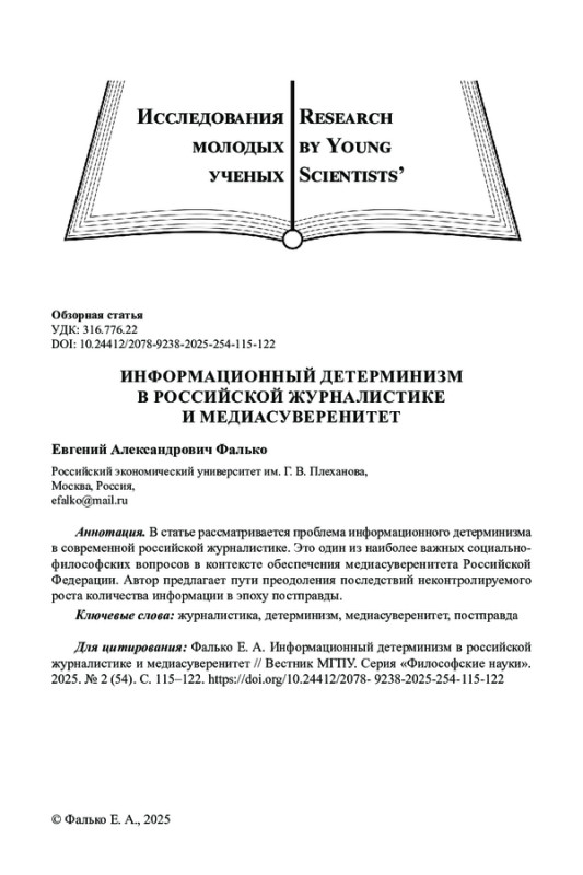 В статье рассматривается проблема информационного детерминизма в современной российской журналистике. Это один из наиболее важных социально-философских вопросов в контексте обеспечения медиасуверенитета Российской Федерации. Автор предлагает пути преодоления последствий неконтролируемого роста количества информации в эпоху постправды.