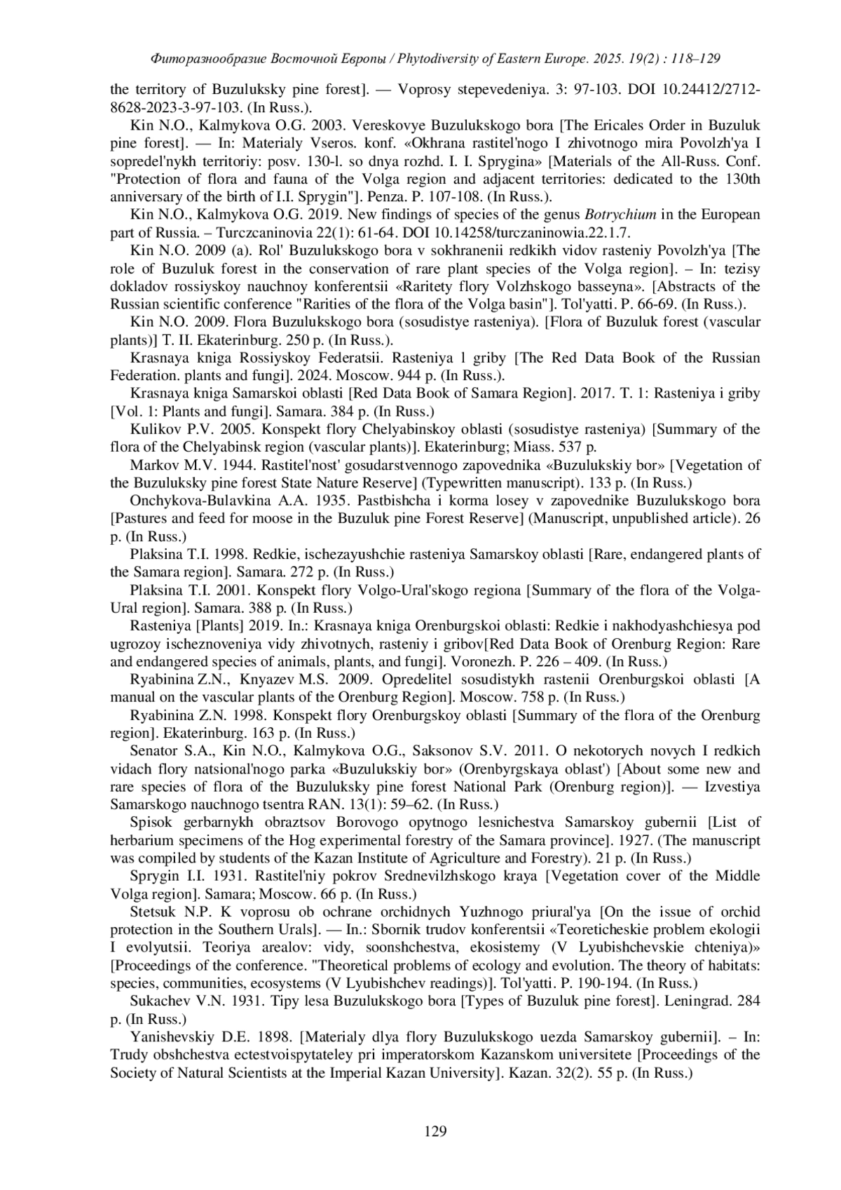 КИН Н. О. СПЕКТР РЕДКИХ И ОХРАНЯЕМЫХ РАСТЕНИЙ САМАРСКОГО И ОРЕНБУРГСКОГО РЕГИОНОВ В УСЛОВИЯХ БУЗУЛУКСКОГО БОРА // ФИТОРАЗНООБРАЗИЕ ВОСТОЧНОЙ ЕВРОПЫ. 2025. Т. 19 № 2