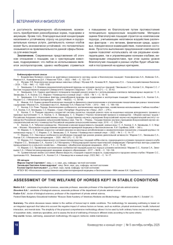 12. Маркин, С.С. Оценка клинического состояния полновозрастных лошадей хобби-класса, содержащихся в условиях городского конного клуба / Маркин С.С., Зиновьева С.А., Козлов С.А.// Материалы V Международной научно-практической конференции “Приоритетные векторы развития промышленности и сельского хозяйства”. - Макеевка: “Донбасская аграрная академия”, 2022. - Т. II. - С. 78-82.
