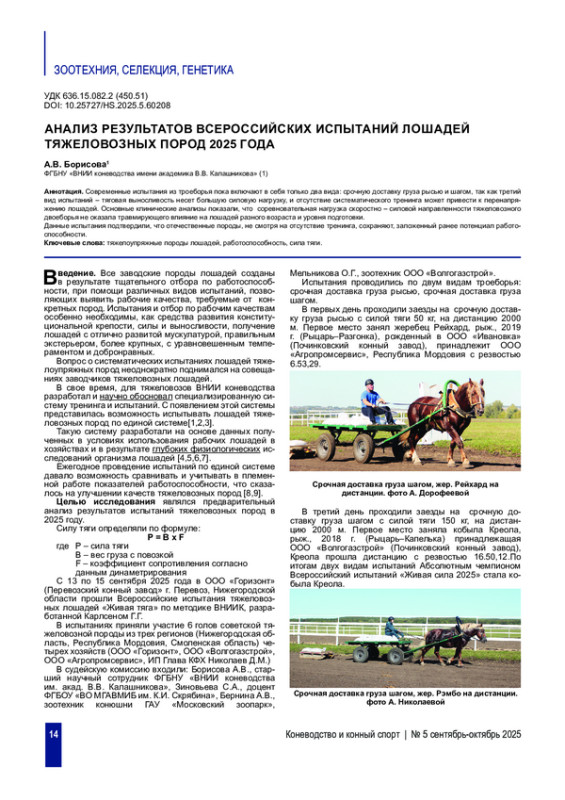 1. Грошев С.Г. Опыт испытания тяжеловозов и их помесей/С.Г. Грошев//Коневодство. 1952. № 3. С. 36-41.