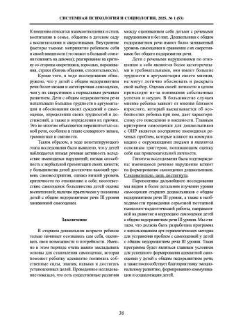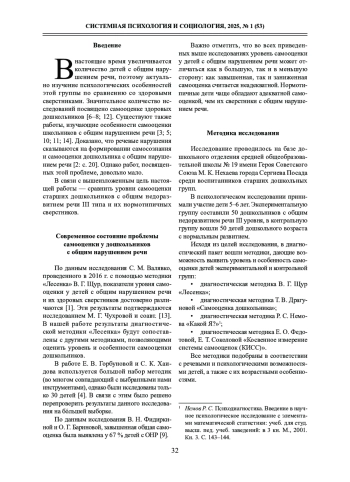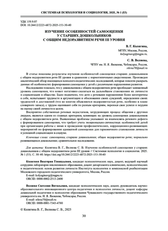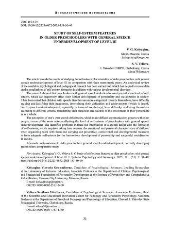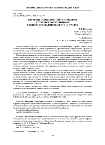 КОЛЯГИНА В. Г., ВЕЛИЕВА С. В. ИЗУЧЕНИЕ ОСОБЕННОСТЕЙ САМООЦЕНКИ У СТАРШИХ ДОШКОЛЬНИКОВ С ОБЩИМ НЕДОРАЗВИТИЕМ РЕЧИ III УРОВНЯ // СИСТЕМНАЯ ПСИХОЛОГИЯ И СОЦИОЛОГИЯ. 2025. № 1 (53)