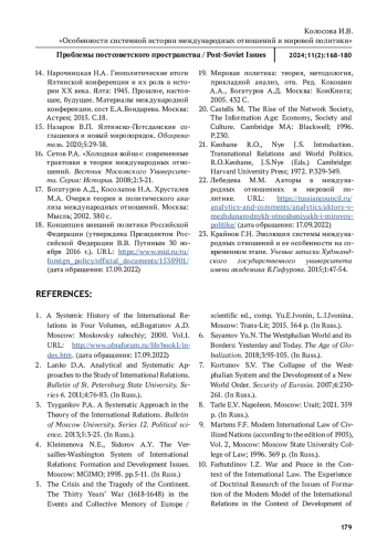 2. Ланко Д.А. Аналитический и системный подходы в исследовании международных отношений. Вестник СПбГУ. Серия 6. 2011;4:76-83.