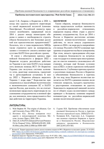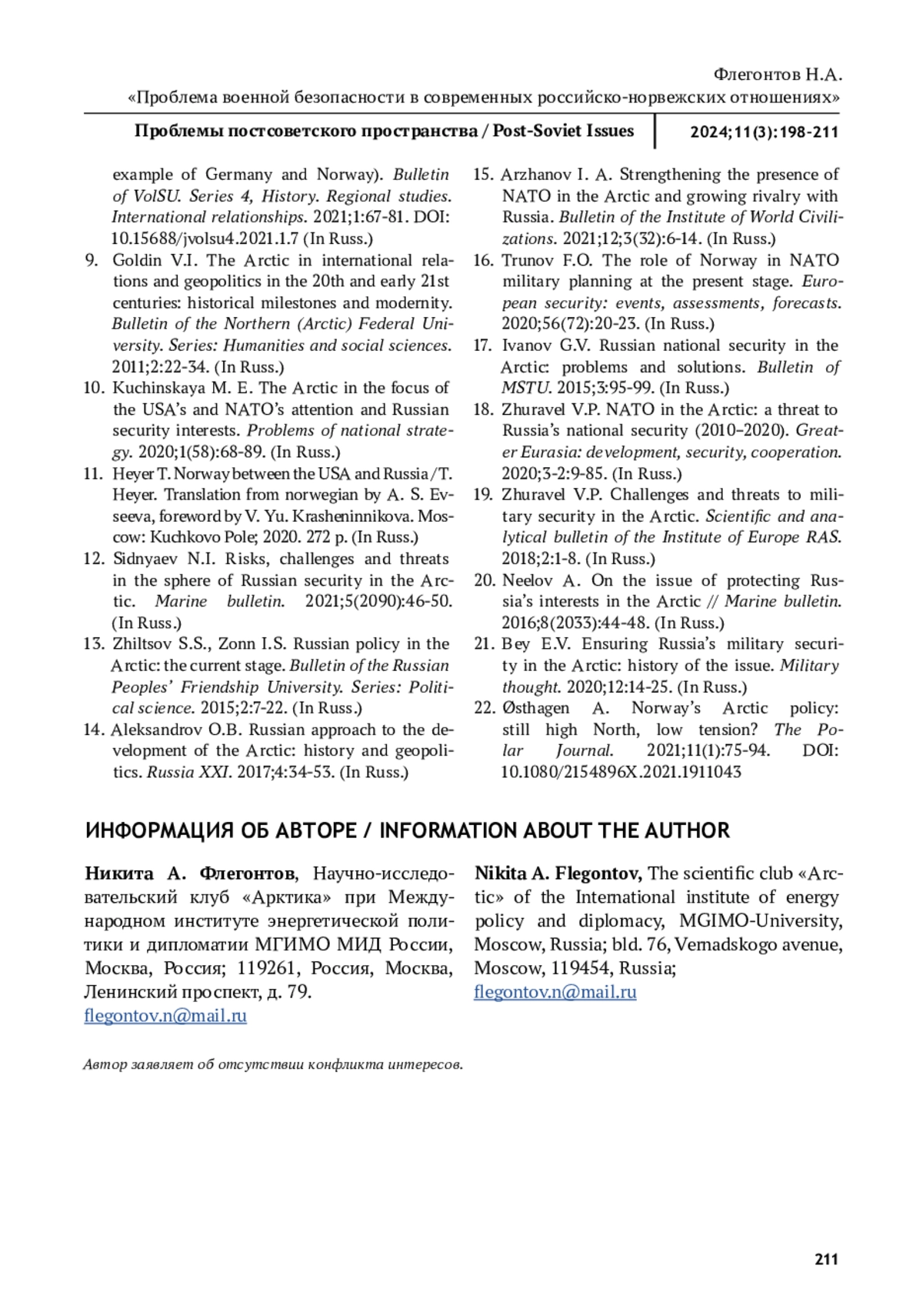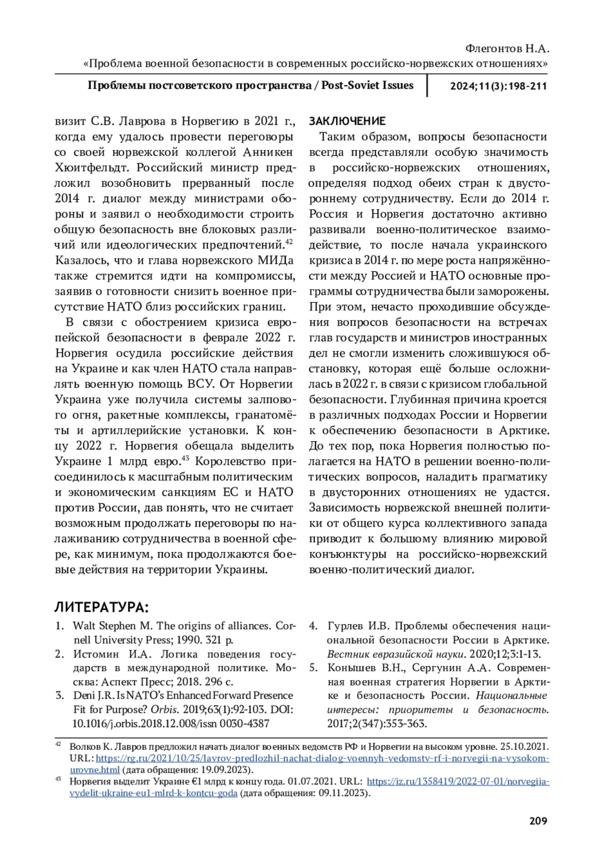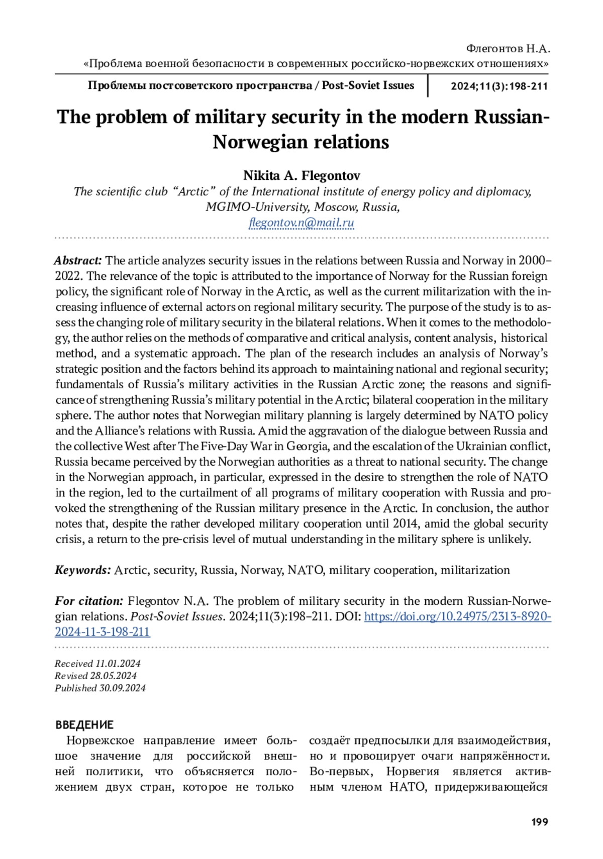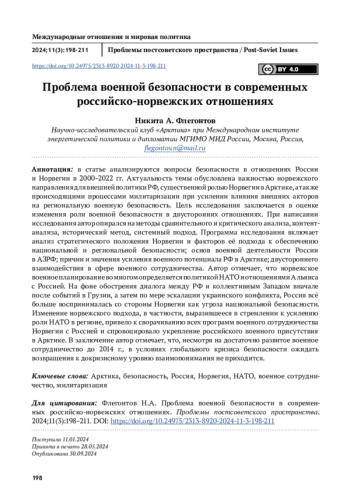ФЛЕГОНТОВ Н. А. ПРОБЛЕМА ВОЕННОЙ БЕЗОПАСНОСТИ В СОВРЕМЕННЫХ РОССИЙСКО-НОРВЕЖСКИХ ОТНОШЕНИЯХ // ПРОБЛЕМЫ ПОСТСОВЕТСКОГО ПРОСТРАНСТВА. 2025. ТОМ 11, № 3