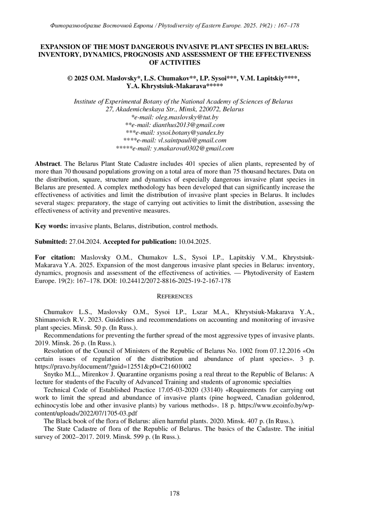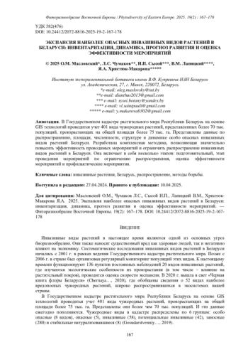 2. [Chumakov et al.] Чумаков Л.С., Масловский О.М., Сысой И.П., Лазарь М.А., Христюк-Макарова Я.А., Шиманович Р.В. 2023. Методические указания и рекомендации по учету и мониторингу инвазивных видов растений. Минск. 50 с.