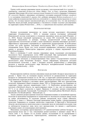 Инвазивные виды растений в настоящее время являются одной из основных угроз биоразнообразию. Они также наносят существенный вред как здоровью людей, так и негативно влияют на экономику. Систематические исследования инвазивных видов растений в Беларуси начались с 2001 г. в рамках ведения Государственного кадастра растительного мира. Позже с 2006 г. в стране был организован регулярный мониторинг популяций этих видов. К настоящему времени функционируют 136 пунктов постоянных наблюдений 20 видов инвазивных растений, где изучаются экологические особенности их произрастания (в том числе – влияние на растительный покров), проводится оценка скорости экспансии. В 2020 г. вышла в свет «Черная книга флоры Беларуси» (Chernaya…, 2020), где обобщены сведения о 52 видах наиболее вредоносных чужеродных растений, широко распространившихся в экосистемах нашей страны.