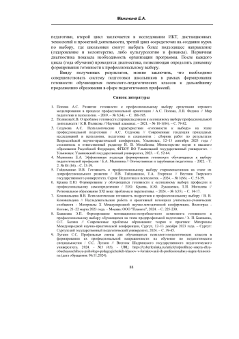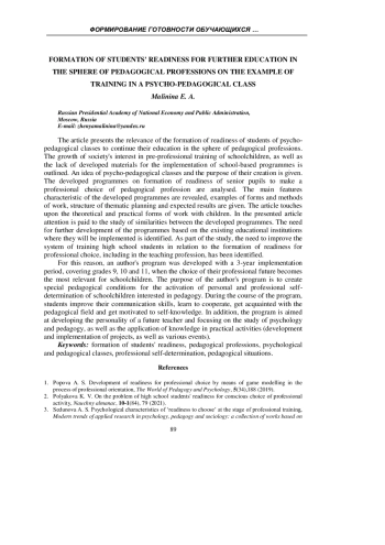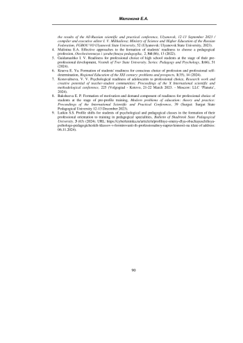 МАЛИНИНА Е. А. ФОРМИРОВАНИЕ ГОТОВНОСТИ ОБУЧАЮЩИХСЯ К ДАЛЬНЕЙШЕМУ ПРОДОЛЖЕНИЮ ОБРАЗОВАНИЯ В СФЕРЕ ПЕДАГОГИЧЕСКИХ ПРОФЕССИЙ НА ПРИМЕРЕ ОБУЧЕНИЯ В ПСИХОЛОГО-ПЕДАГОГИЧЕСКОМ КЛАССЕ // УЧЕНЫЕ ЗАПИСКИ КРЫМСКОГО ФЕДЕРАЛЬНОГО УНИВЕРСИТЕТА ИМЕНИ В. И. ВЕРНАДСКОГО. СОЦИОЛОГИЯ. ПЕДАГОГИКА. ПСИХОЛОГИЯ. 2025. ТОМ 11 (77). № 3