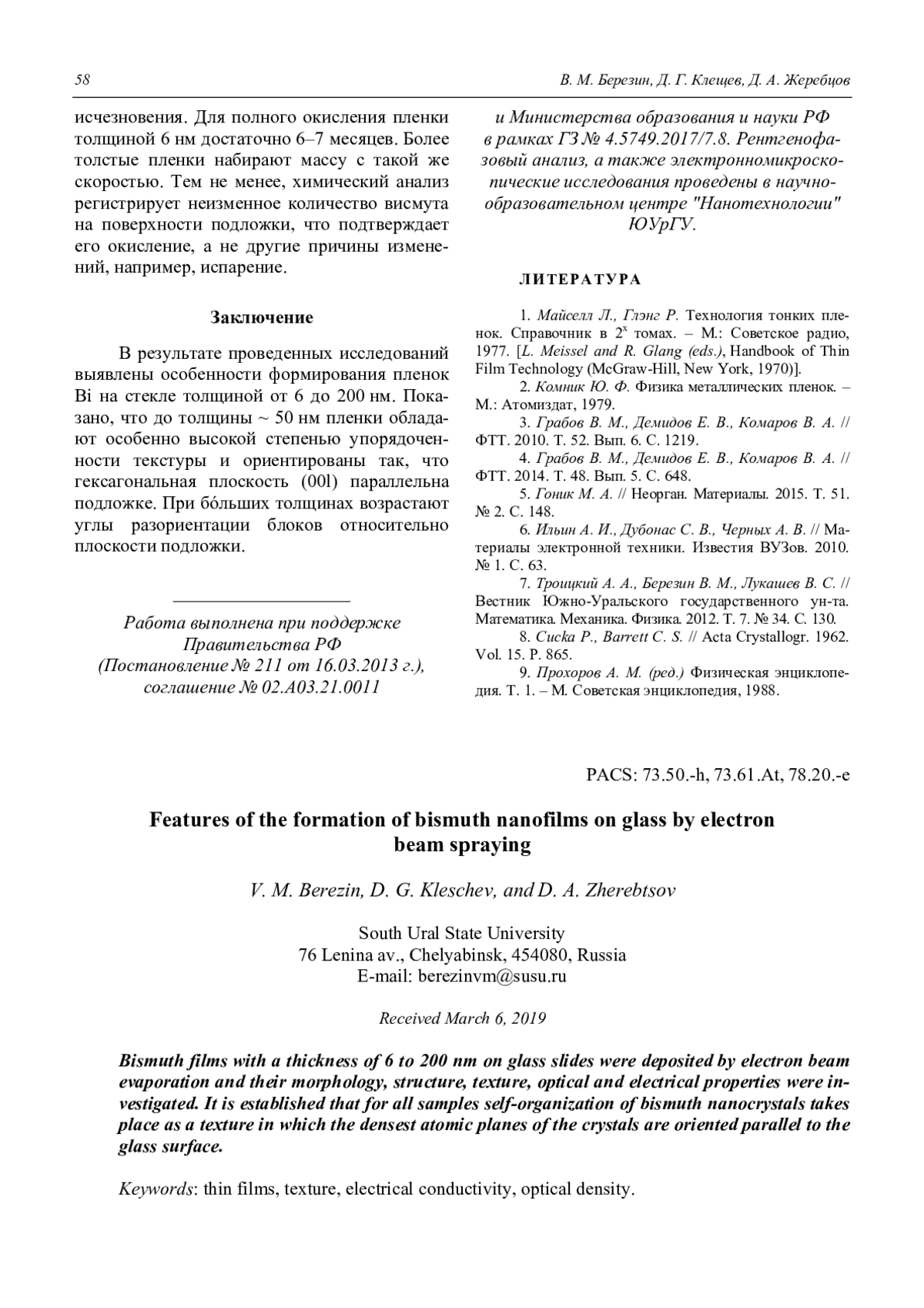 V. M. Berezin, D. G. Kleschev, and D. A. Zherebtsov Features of the formation of bismuth nanofilms on glass by electron beam spraying 53