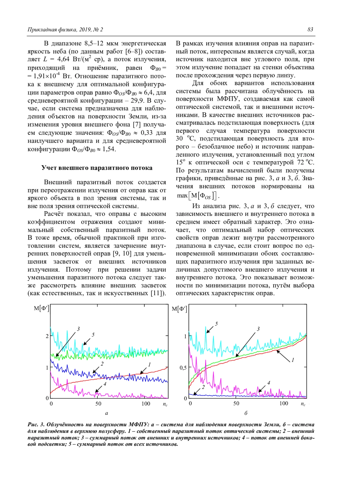 В статье рассматривается влияние конструктивных элементов оправ ИК объектива, предназначенного для работы в диапазоне 8,5–12 мкм, на величину дополнительной (паразитной) облученности фоточувствительных элементов. Дополнительная облученность матричного фотоприёмного устройства (МФПУ) складывается из изучения от внешних источников, рассеянных на элементах объектива и собственного излучения оптической системы. Вклад каждой из составляющих зависит от внешних условий и характеристик оптической системы. Оптимизация оптических характеристик и формы оправ позволяет влиять на обе величины, что ведёт к возможности создания системы, обладающей минимальным паразитным потоком в требуемых условиях эксплуатации. Рассмотрена минимизация дополнительной (паразитной) облученности на примере систем двух типов: предназначенных для наблюдения удалённых объектов на фоне неба и на поверхности Земли.