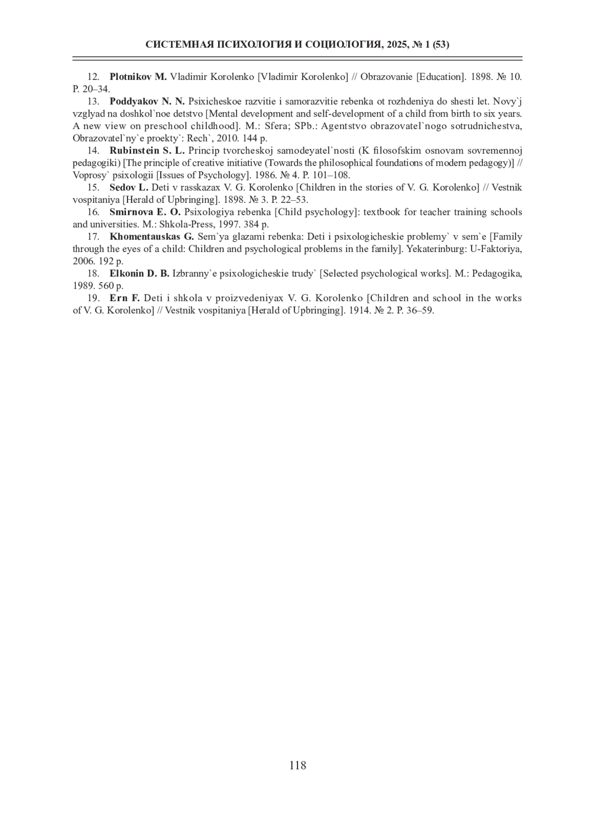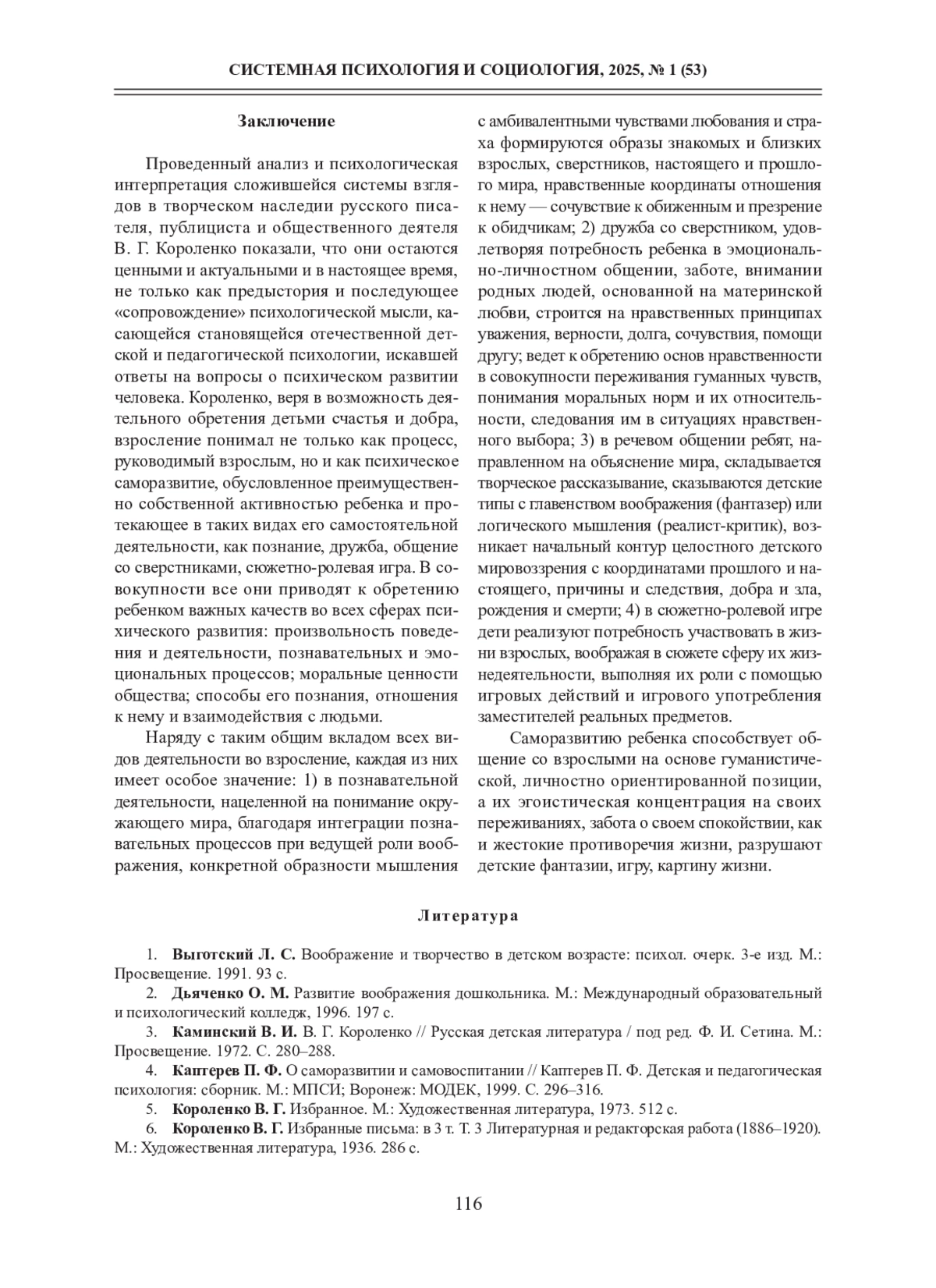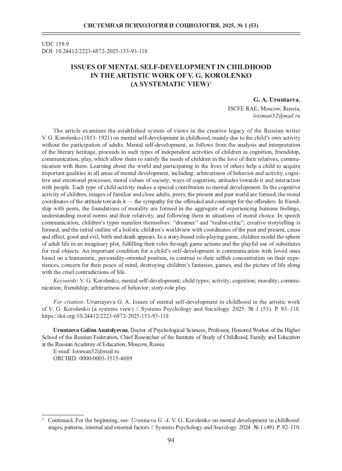 УРУНТАЕВА Г. А. ВОПРОСЫ ПСИХИЧЕСКОГО САМОРАЗВИТИЯ В ДЕТСТВЕ В ХУДОЖЕСТВЕННОМ ТВОРЧЕСТЕ В. Г. КОРОЛЕНКО (СИСТЕМНЫЙ ВЗГЛЯД) // СИСТЕМНАЯ ПСИХОЛОГИЯ И СОЦИОЛОГИЯ. 2025. № 1 (53)