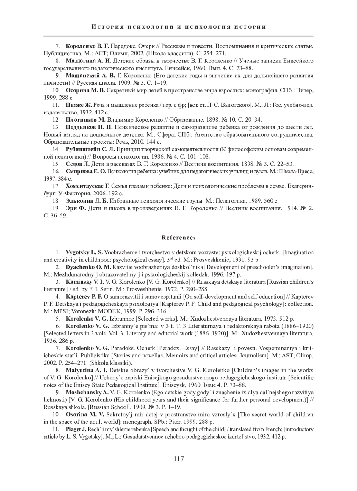 В статье рассматривается сложившаяся в творческом наследии русского писателя В. Г. Короленко (1853-1921) система взглядов на психическое саморазвитие в детстве, обусловленное в основном собственной активностью ребенка, без участия взрослых. Психическое саморазвитие, как следует из анализа и интерпретации писательского наследия, протекает в таких видах самостоятельной деятельности детей, как познание, дружба, общение, игра, которые позволяют удовлетворять потребности ребят в любви родных людей, общении с ними. Познание мира, участие в жизни других помогают ребенку обрести важные качества во всех сферах психического развития, среди которых произвольность поведения и деятельности, познавательных и эмоциональных процессов; моральные ценности общества; способы его познания, отношение к нему и взаимодействие с людьми. Каждый вид детской деятельности вносит особый вклад в психическое развитие. В познавательной деятельности детей формируются образы знакомых и близких взрослых, сверстников, настоящего и прошлого мира, нравственные координаты отношения к нему - сочувствие к обиженным и презрение к обидчикам. В дружбе со сверстниками складываются основы нравственности в совокупности переживания гуманных чувств, понимания моральных норм и их относительности, следования им в ситуациях нравственного выбора. В речевом общении проявляются детские типы - «фантазер» и «реалист-критик», - формируется творческое рассказывание, возникает начальный контур целостного детского мировоззрения с координатами прошлого и настоящего, причины и следствия, добра и зла, рождения и смерти. В сюжетно-ролевой игре дети в воображаемом сюжете моделируют сферу жизнедеятельности взрослых, выполняя их роли с помощью игровых действий и игрового употребления заместителей реальных предметов. Важным условием саморазвития ребенка становится общение с близкими людьми, основанное на гуманистической, личностно ориентированной позиции в отличие от их эгои стической концентрации на своих переживаниях, заботе о своем спокойствии, разрушающих детские фантазии, игру, картину жизни наряду с жестокими противоречиями жизни.
