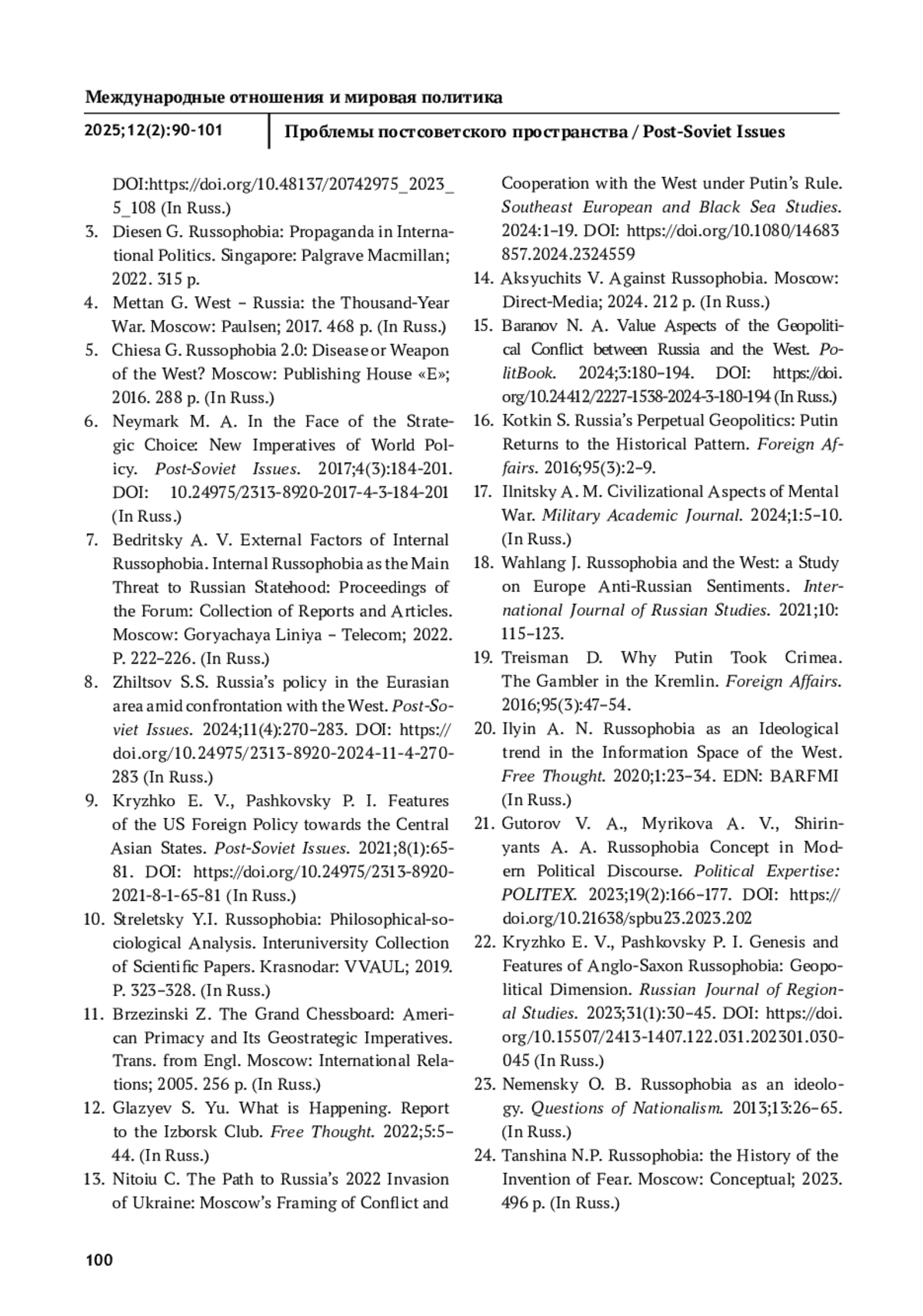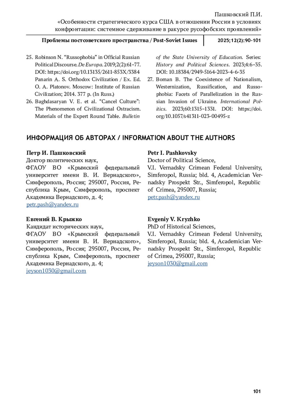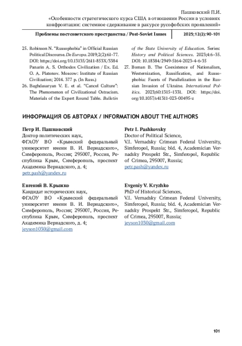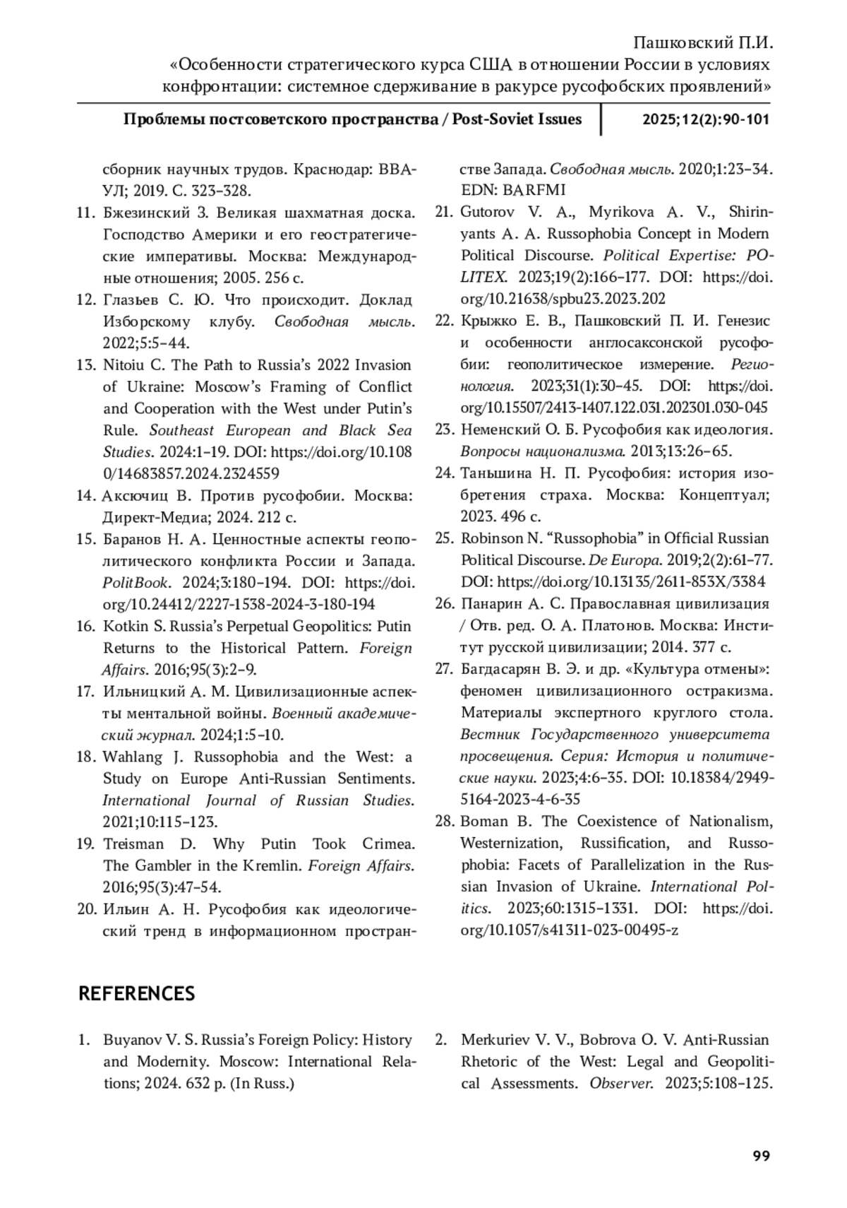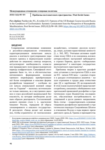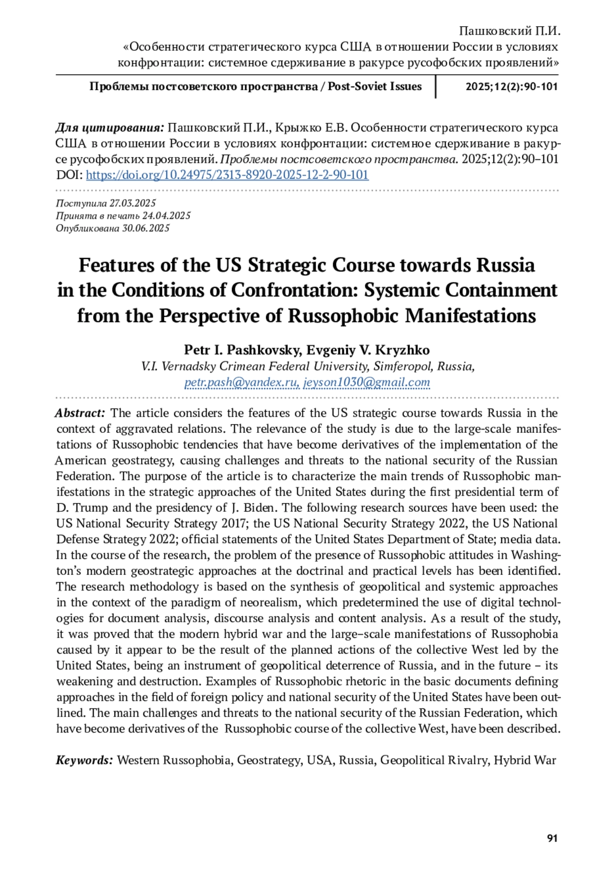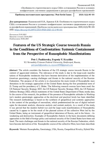 ПАШКОВСКИЙ П. И., КРЫЖКО Е. В. ОСОБЕННОСТИ СТРАТЕГИЧЕСКОГО КУРСА США В ОТНОШЕНИИ РОССИИ В УСЛОВИЯХ КОНФРОНТАЦИИ: СИСТЕМНОЕ СДЕРЖИВАНИЕ В РАКУРСЕ РУСОФОБСКИХ ПРОЯВЛЕНИЙ // ПРОБЛЕМЫ ПОСТСОВЕТСКОГО ПРОСТРАНСТВА. 2025. ТОМ 12, № 2